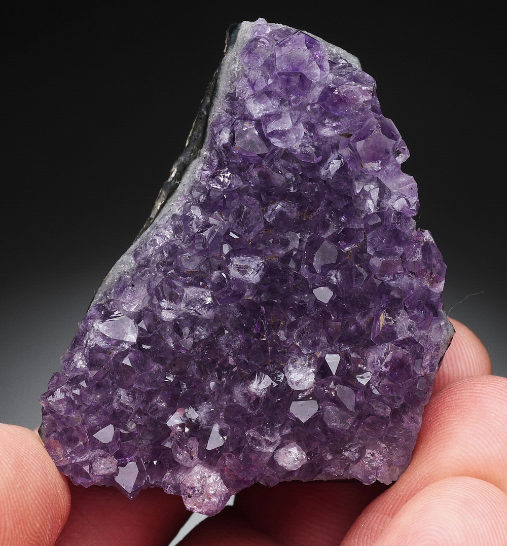 Błyszcząca szczotka dobrze wybarwionych kryształów ametystu.