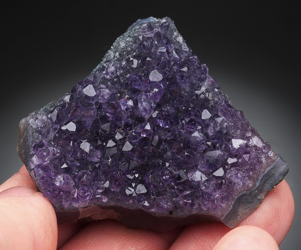 Błyszcząca szczotka dobrze wybarwionych kryształów ametystu.