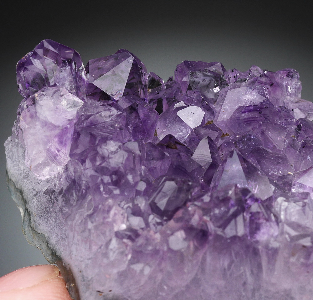 Błyszcząca szczotka dobrze wybarwionych kryształów ametystu.