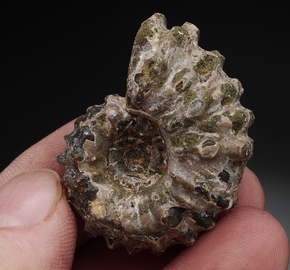 Dobrze zachowany okaz kredowego amonita Douvelliceras z zachowaną aragonitową muszla wykazującą wielobarwną opalescencję.