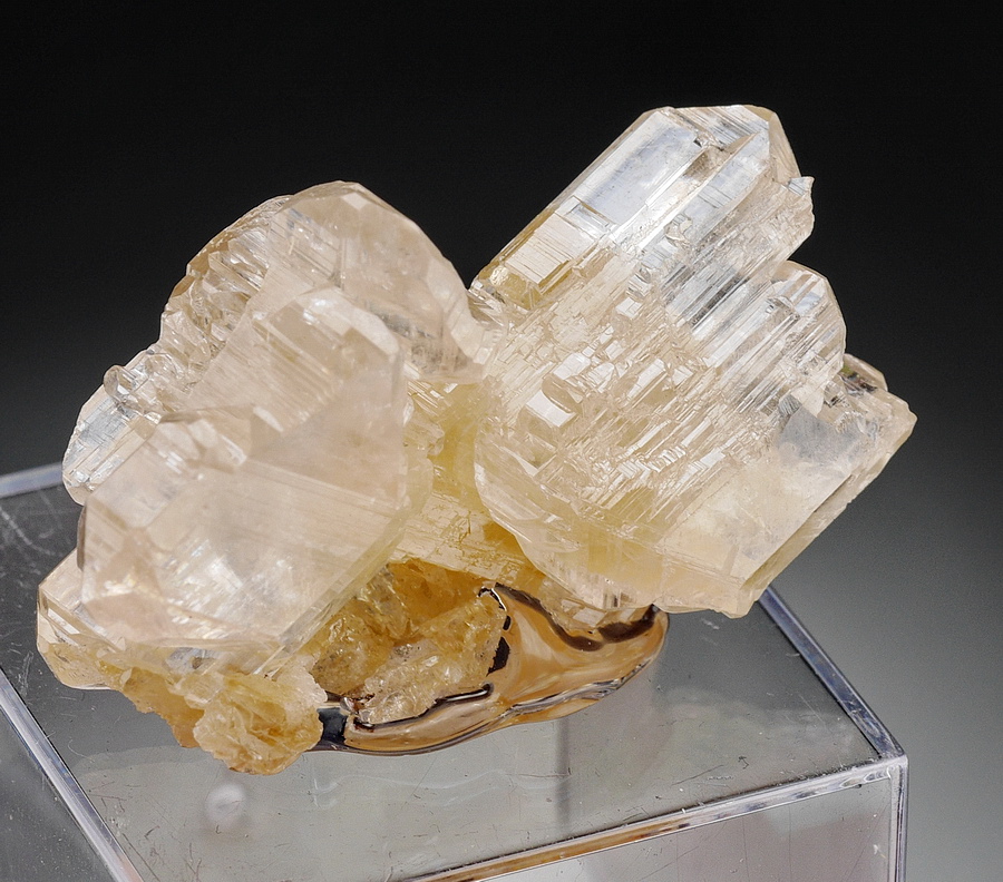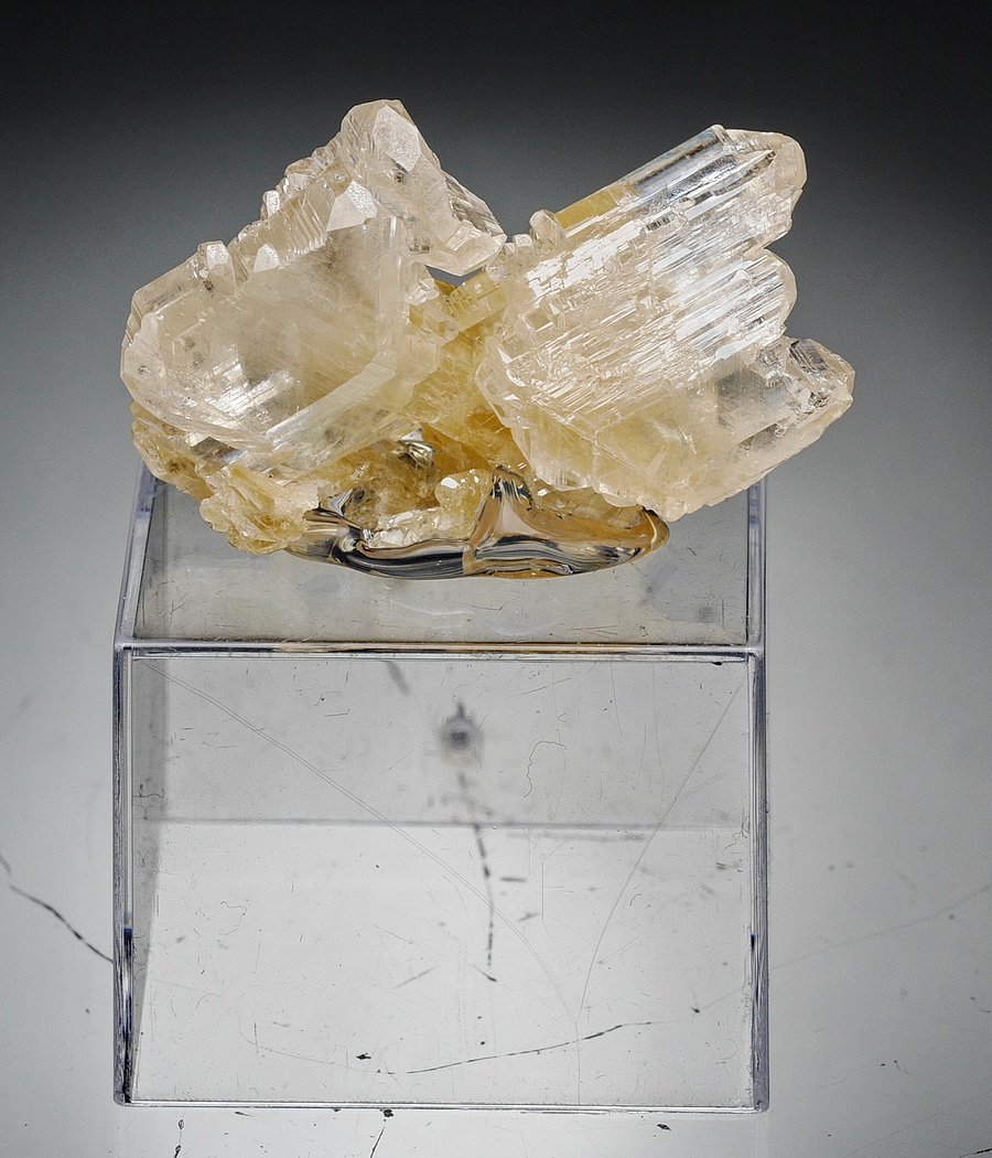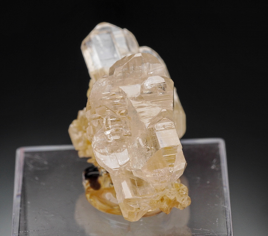 Bardzo błyszczący zrost przeświecających kryształów cerusytu. Okaz przyklejony na podstawce.