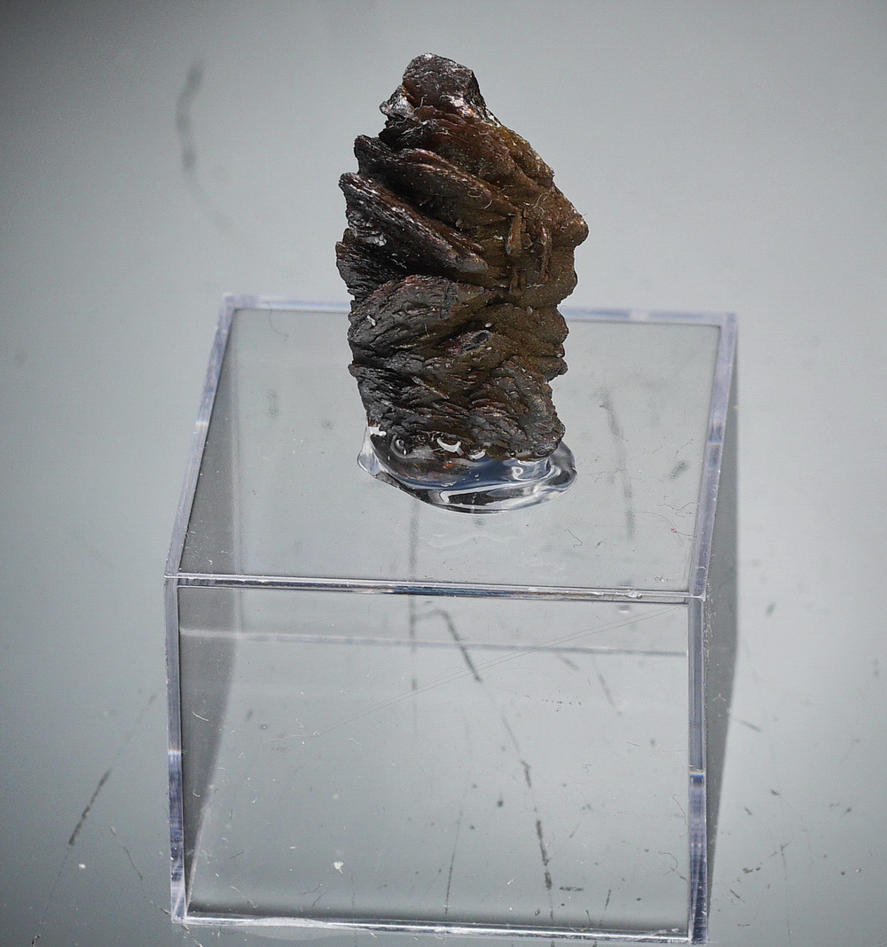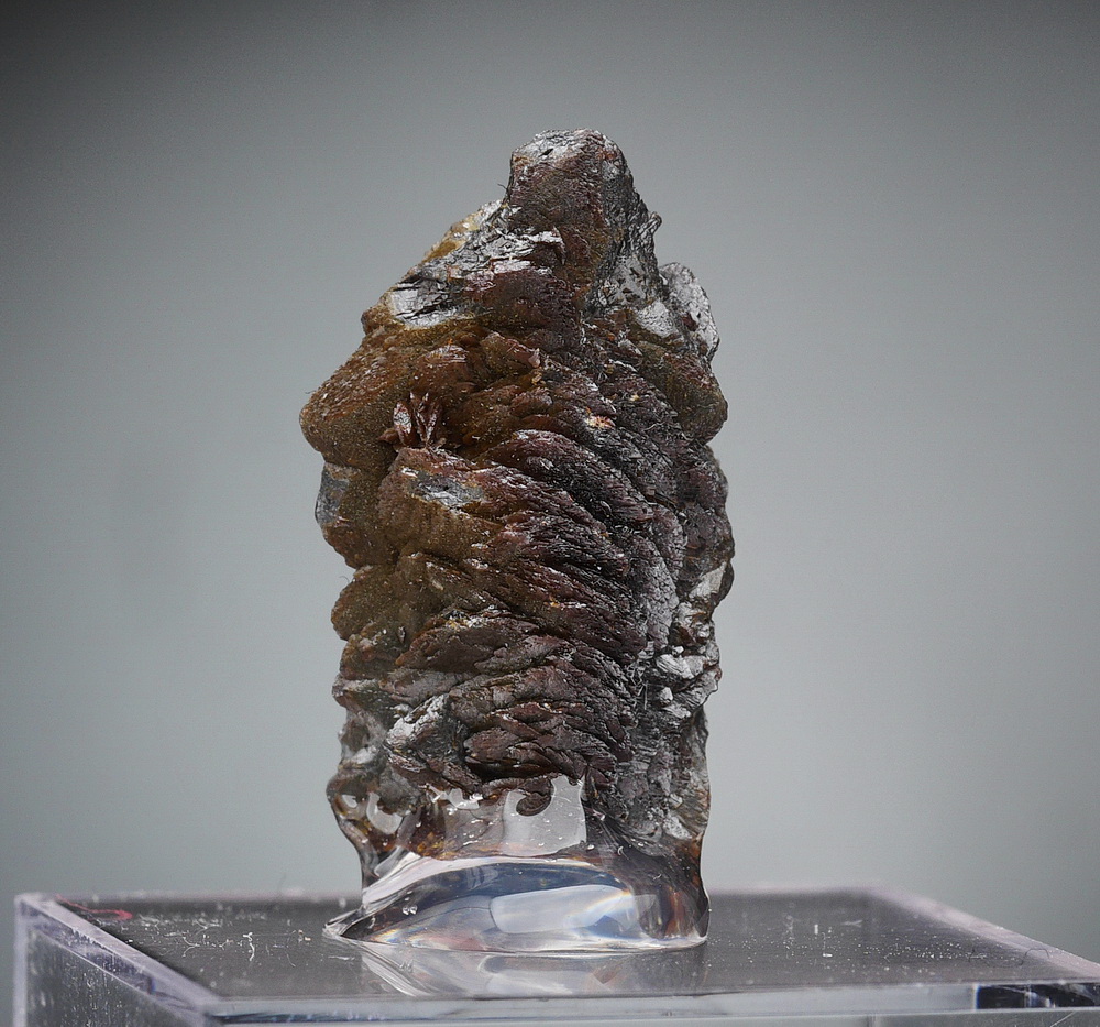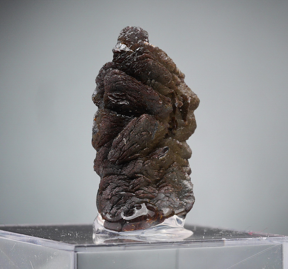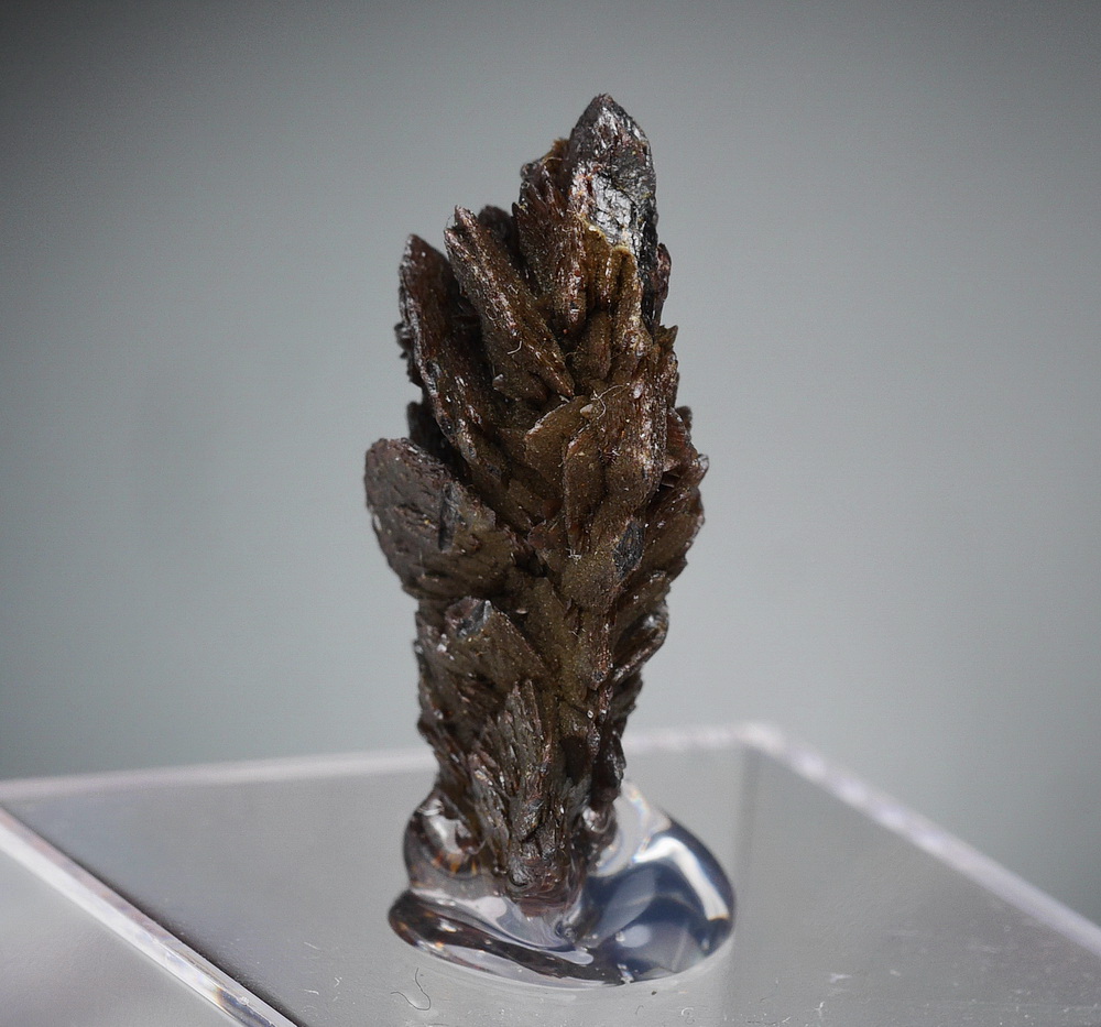 Szczotka dobrze wykształconych i błyszczących kryształów rzadkiego descloizytu. Okaz przyklejony na podstawce.