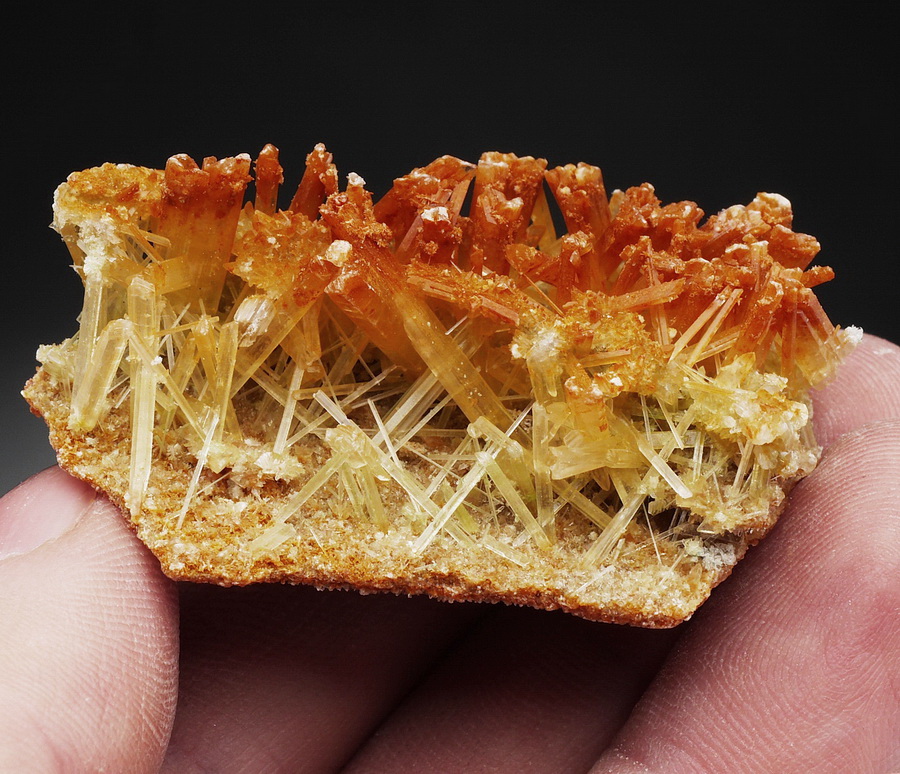 Zrost ładnie wykształconych i błyszczących kryształów gipsu z inkluzjami żelazistymi. Kryształy częsciowo przezroczyste.