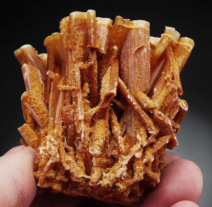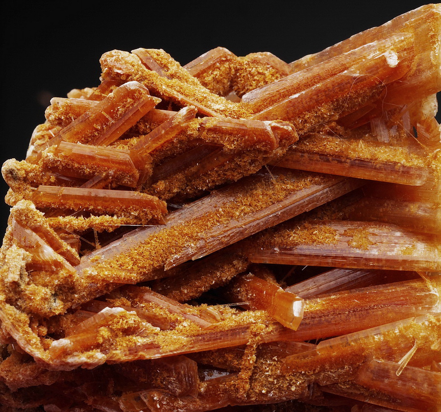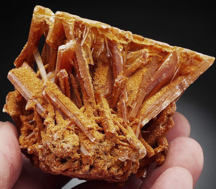 Zrost ładnie wykształconych i błyszczących kryształów gipsu z inkluzjami żelazistymi. Kryształy częsciowo przezroczyste.