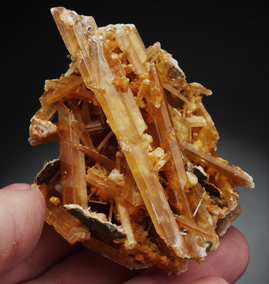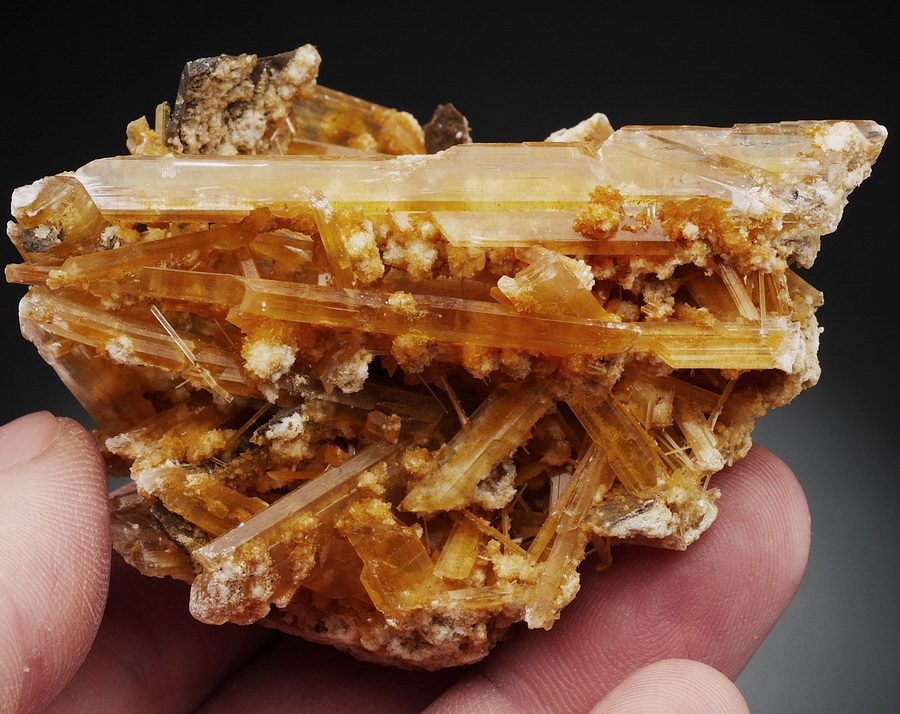 Zrost ładnie wykształconych i błyszczących kryształów gipsu z inkluzjami żelazistymi. Kryształy częsciowo przezroczyste.