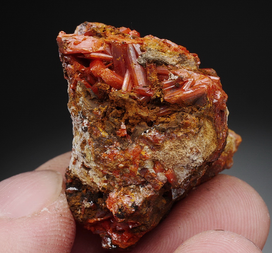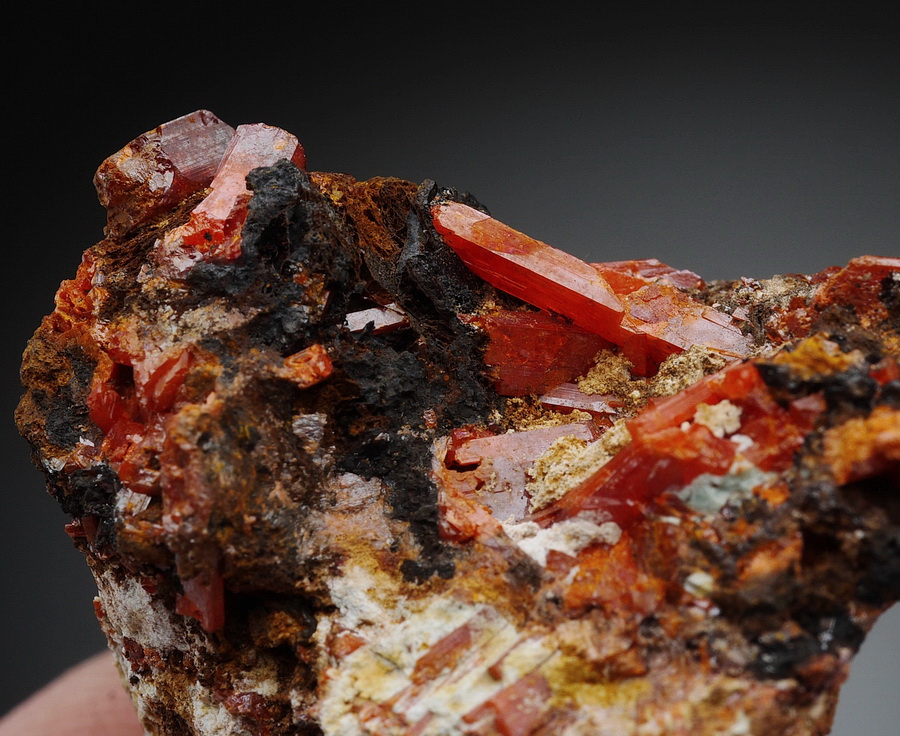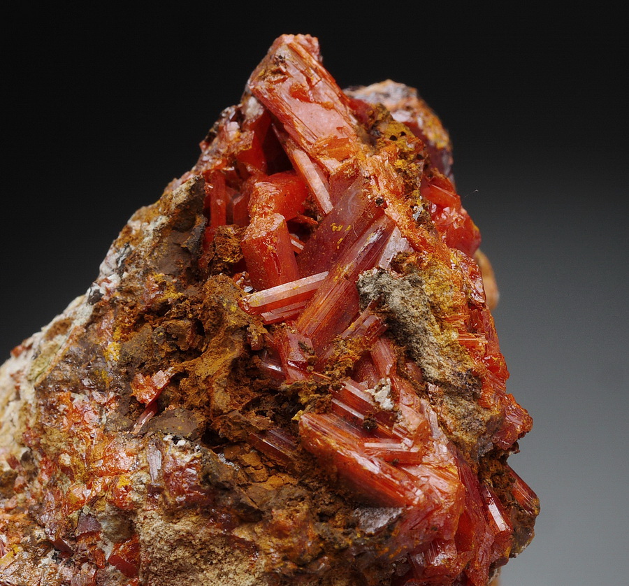 Bardzo błyszczące kryształy czerwonego krokoitu na limonicie.