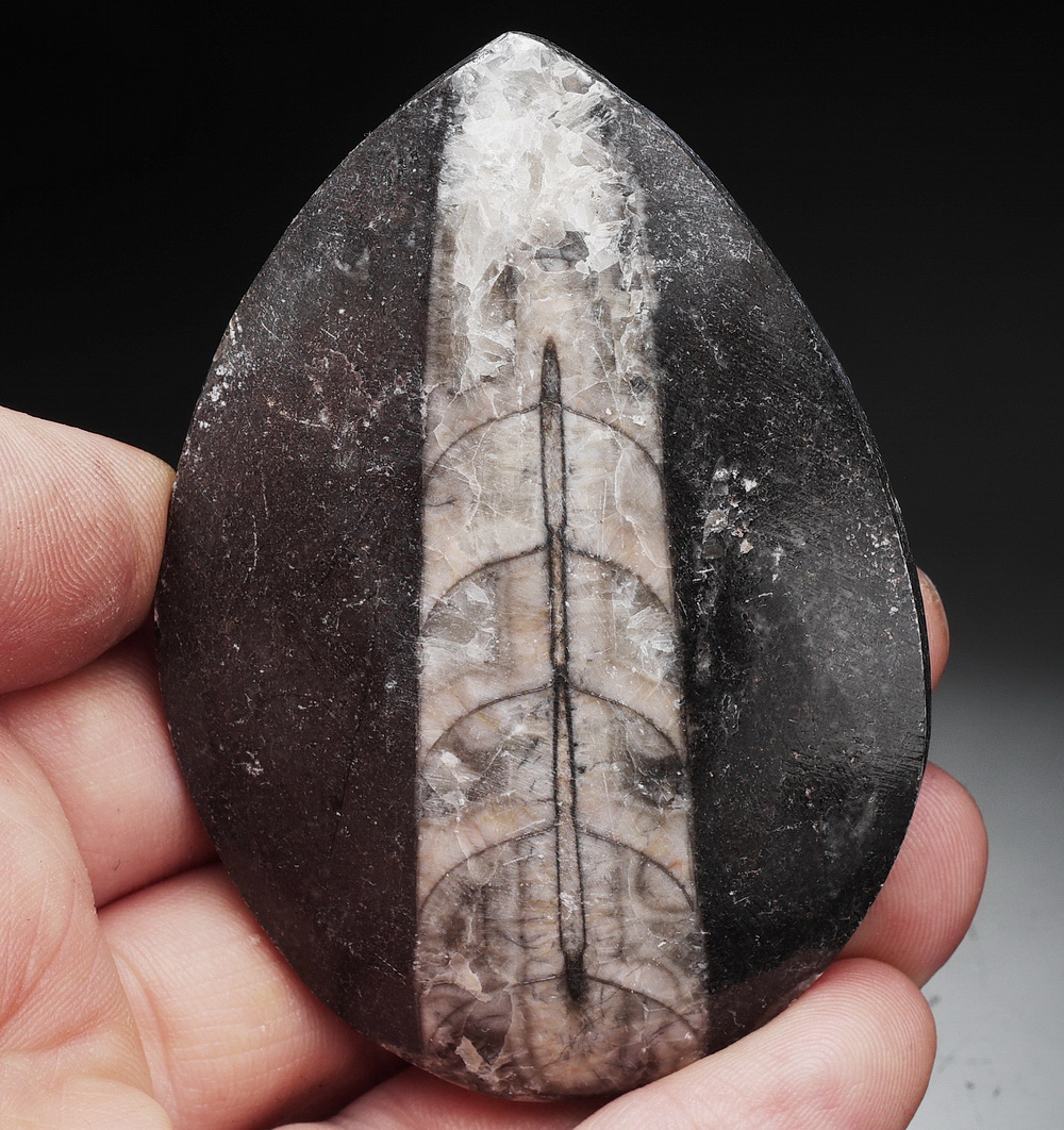 Polerowany okaz muszli / fragmokonu łodzika Orthoceras.