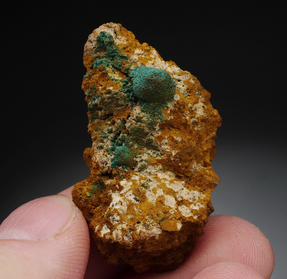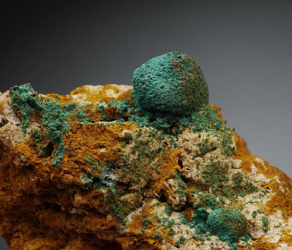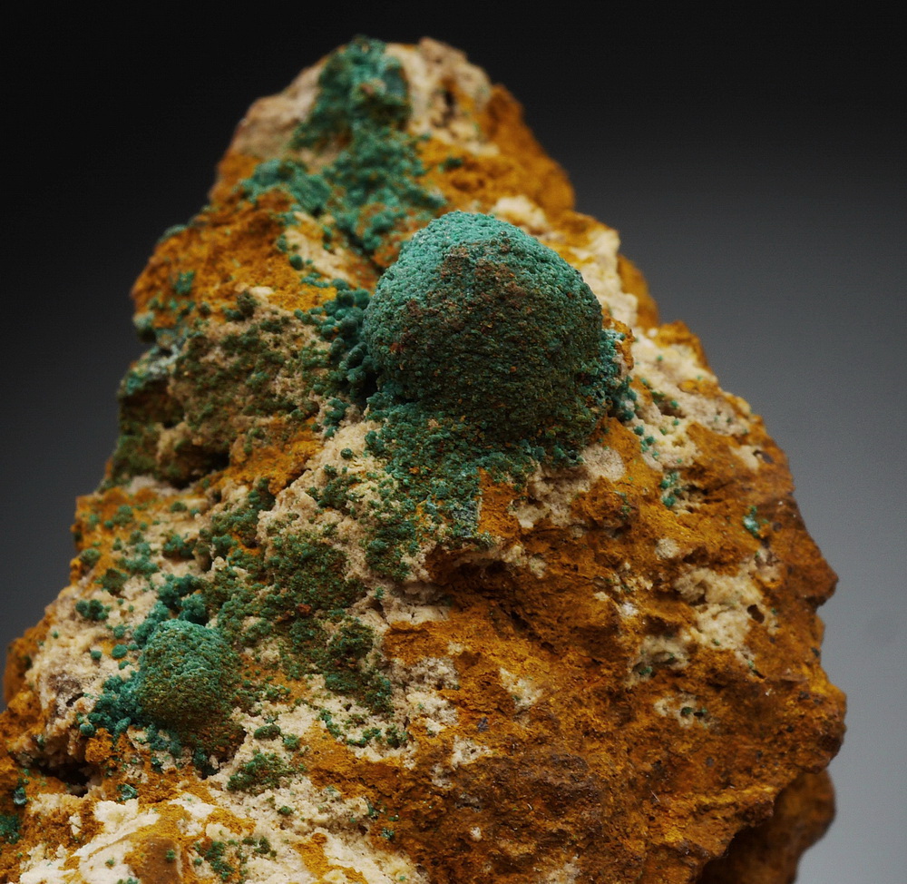 Pseudomorfozy malachitu po kuprycie na limonitowym matrixie.