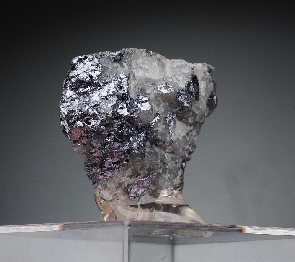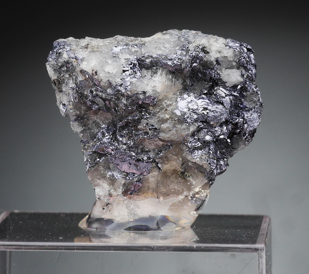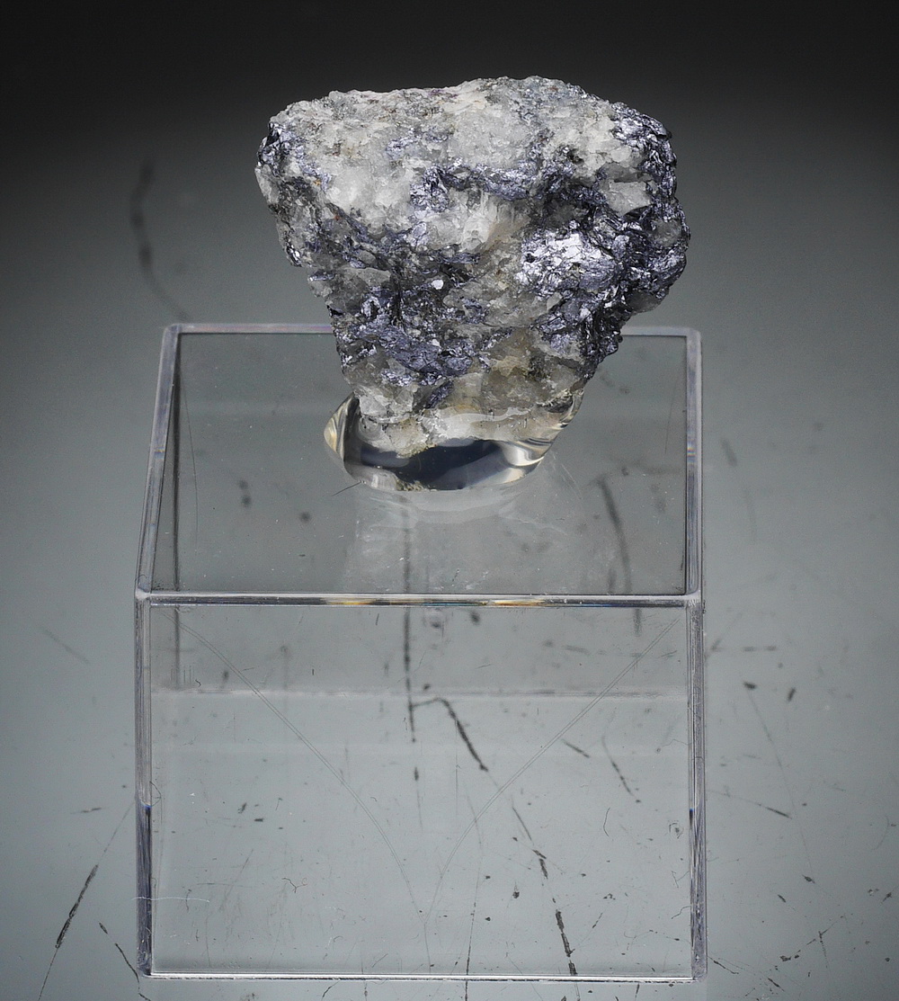 Duże błyszczące skupienia srebrzytsego molibdenitu na kwarcowym matrixie. Okaz przyklejony na podstawce.