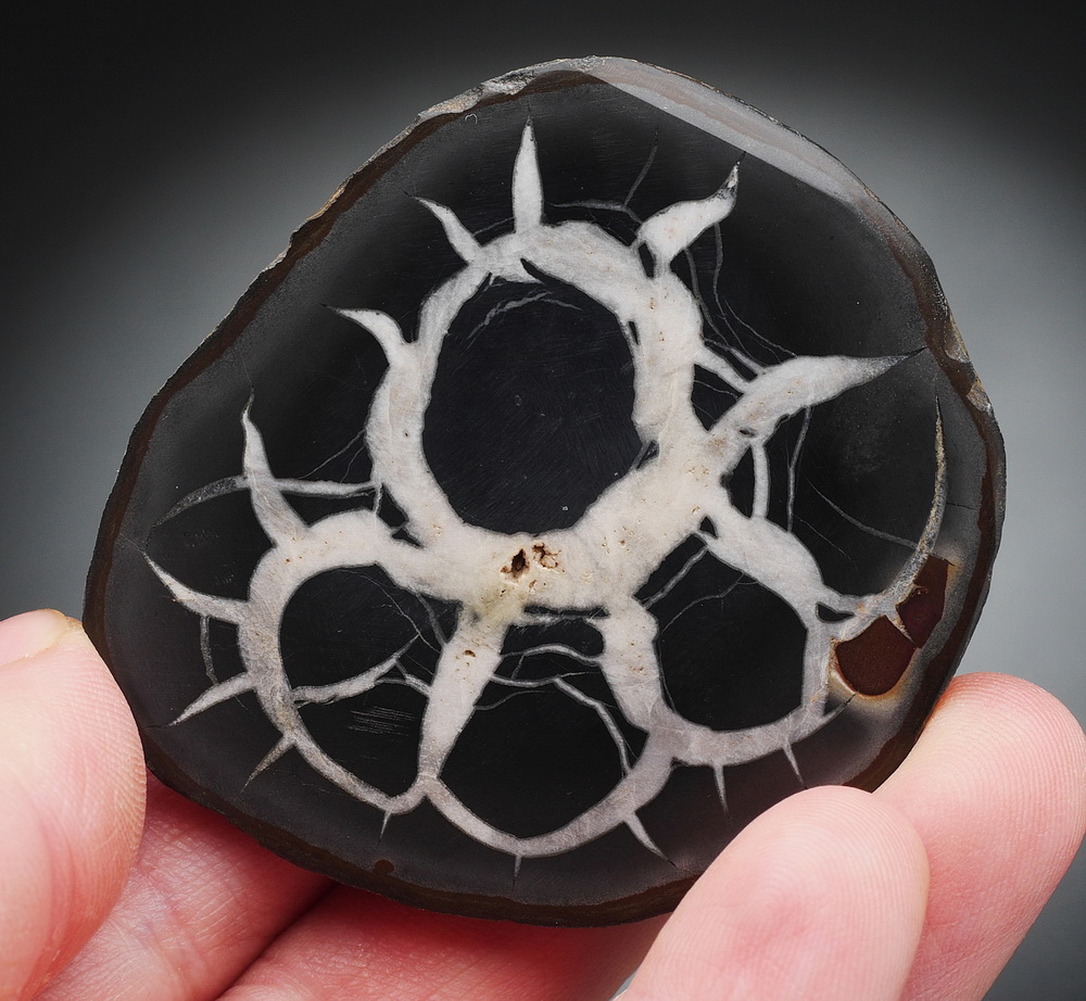 Polerowana połowka septari ilasto-żelazistej z szczelinami kalcytowymi w fantastycznym kształcie.