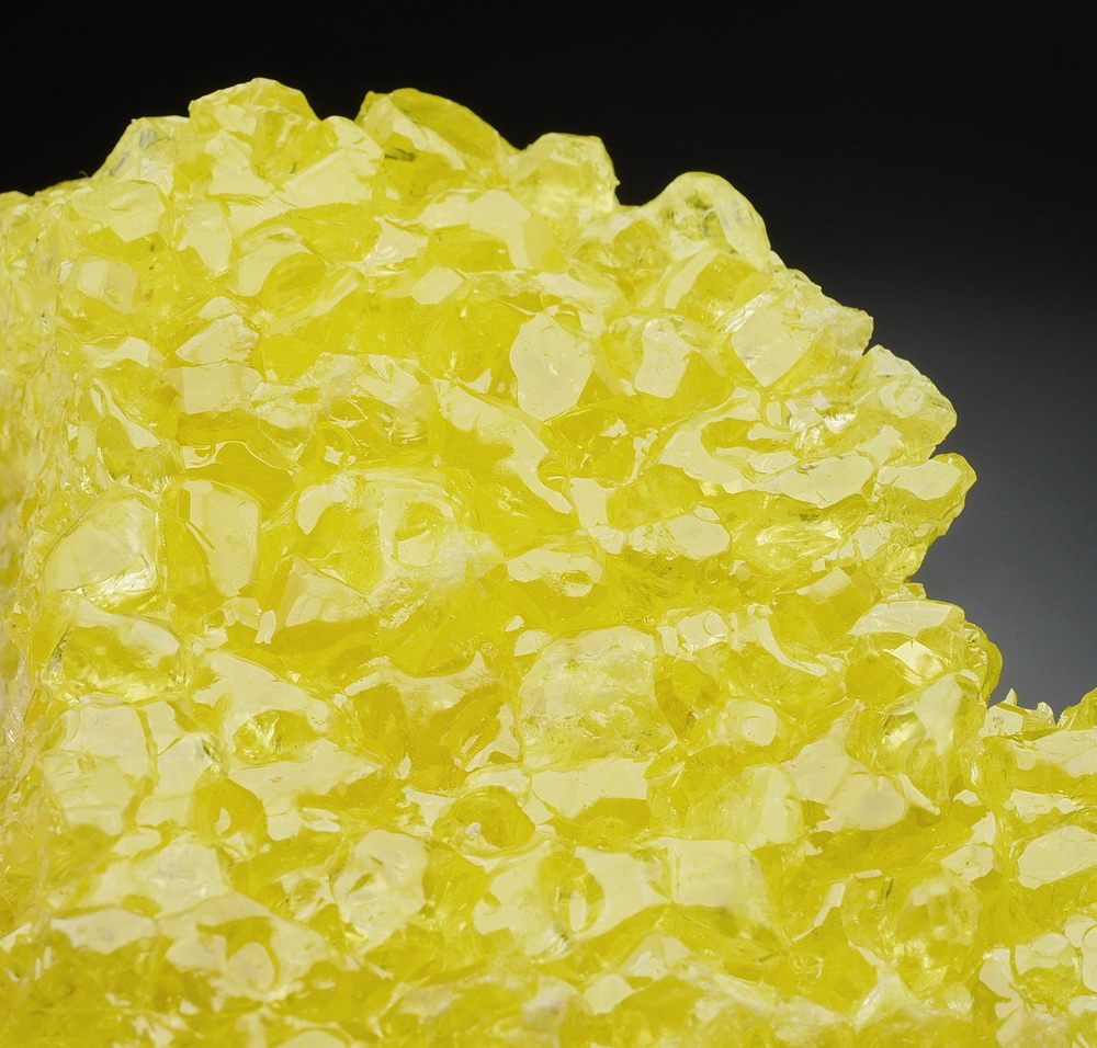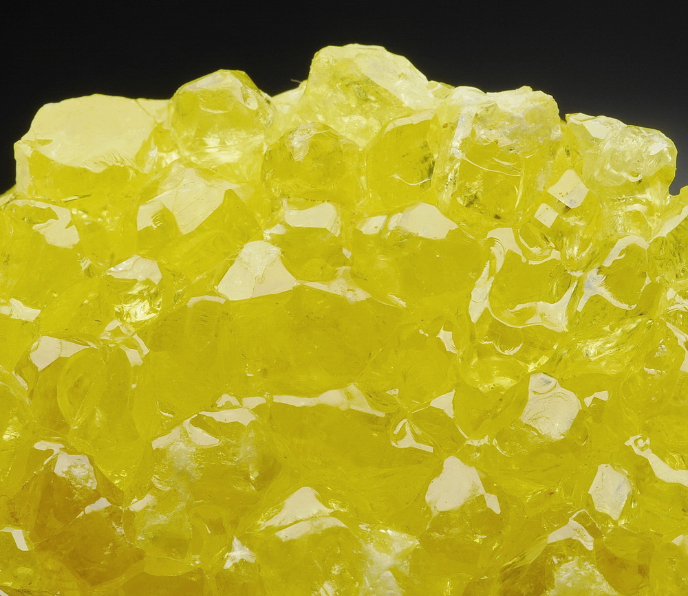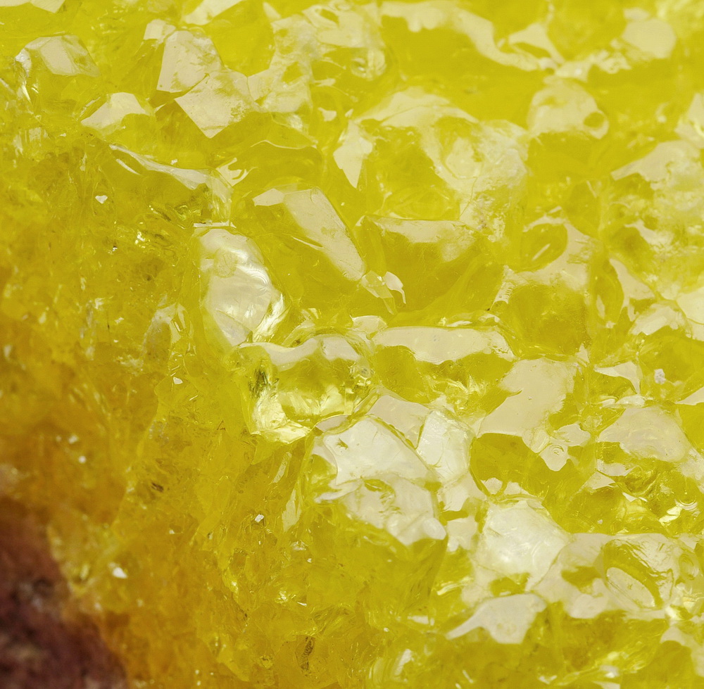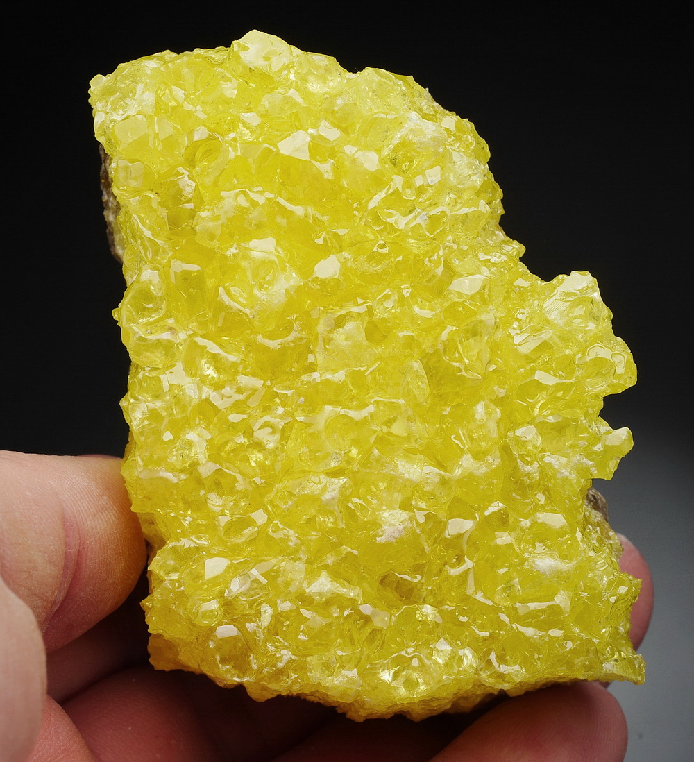 Dobrze wykształcone, przeświecające i błyszczące kryształ siarki rodzimej na matrixie tworzące piękną szczotkę.