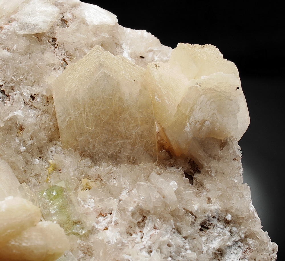 Błyszczący zrost kryształów stilbitu i apofyllitu.