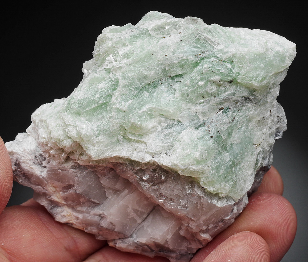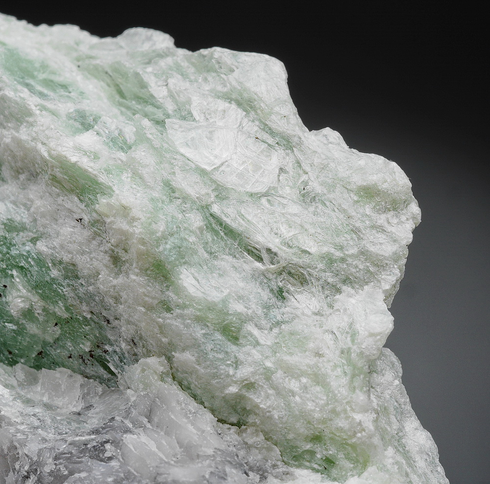 Blaszkowe, błyszczące skupienia talku z kalcytem z rzadkiej lokalizacji. Talk to najmiększy minerał na świecie - wzorcowy o twardości 1 w skali Mohsa