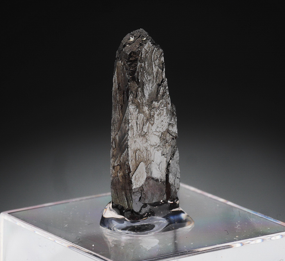 Błyszczący kryształ rzadkiego wolframitu. Okaz przyklejony na podstawce.