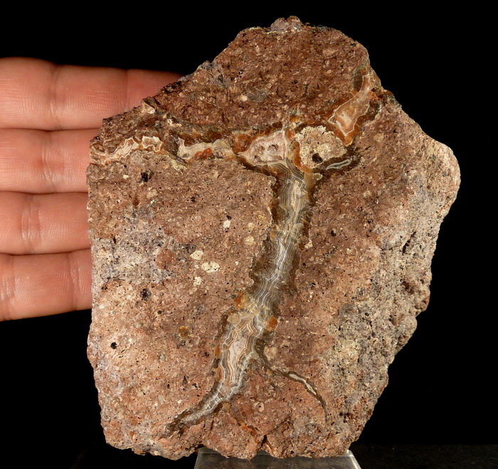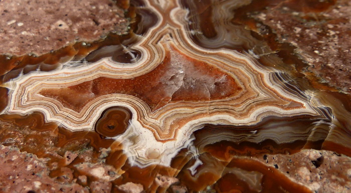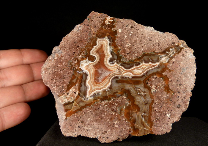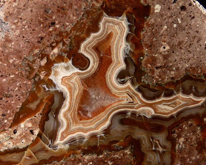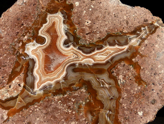 Przecięty i wypolerowany permski porfir z agatem o pięknym niepowtarzalnym rysunku w formie ostroramiennej gwiazdy.