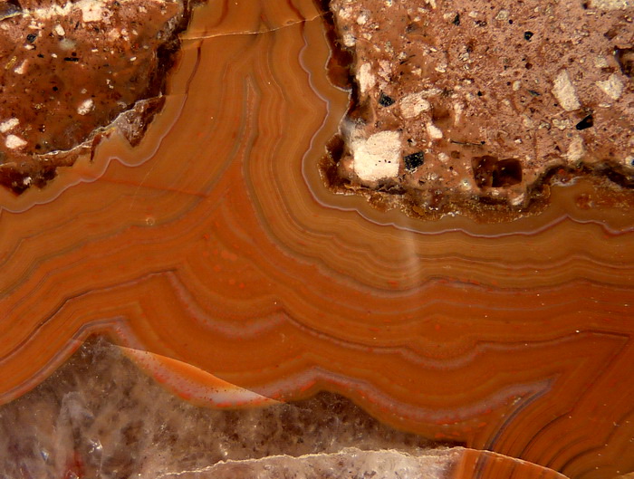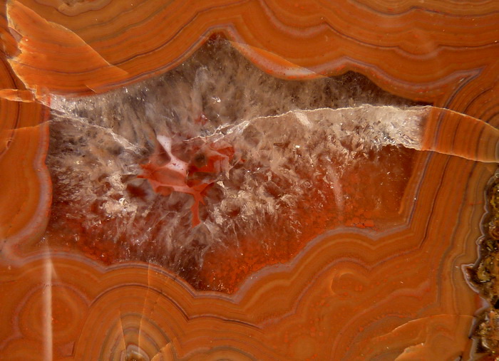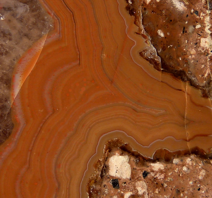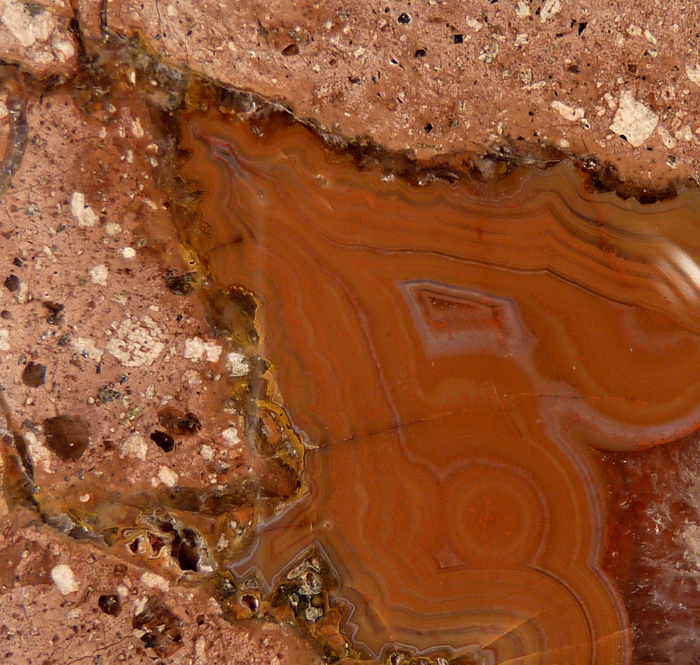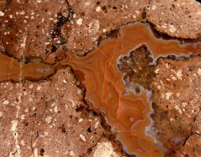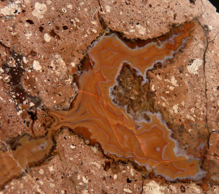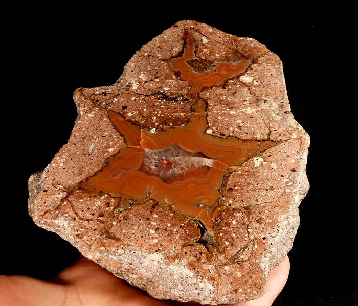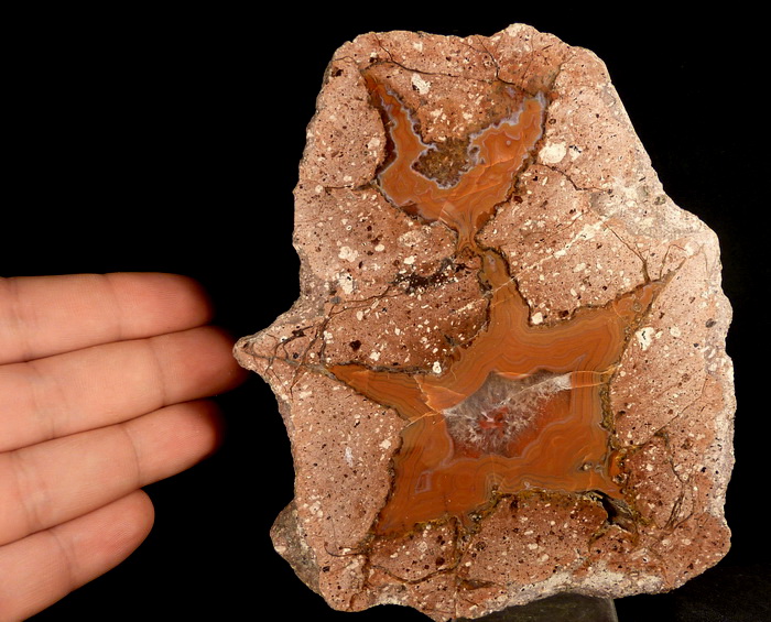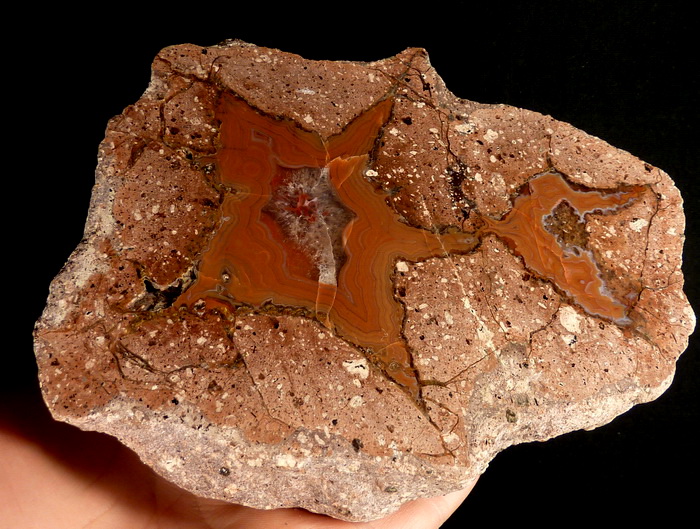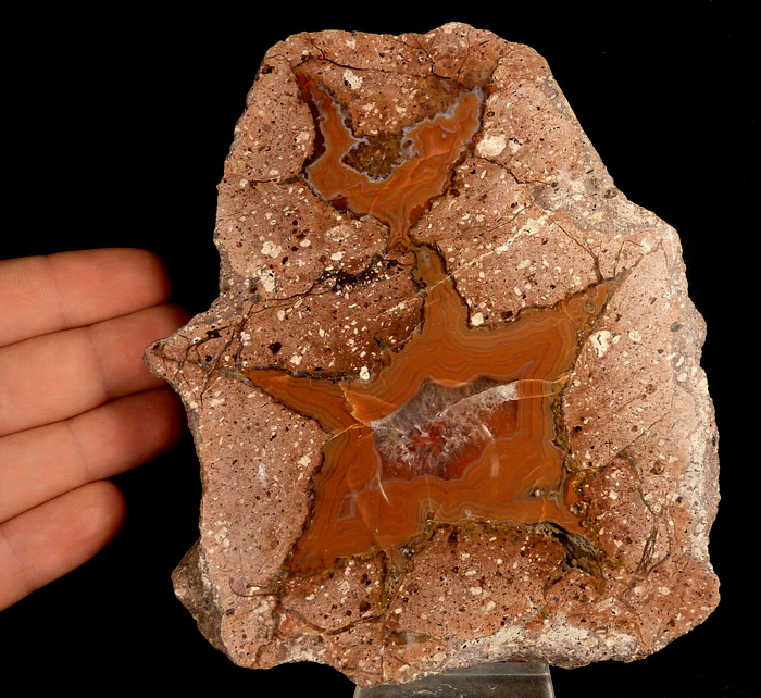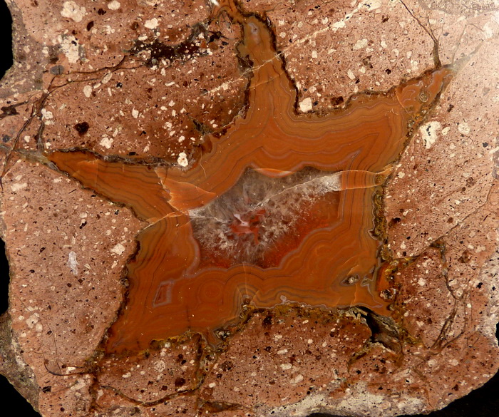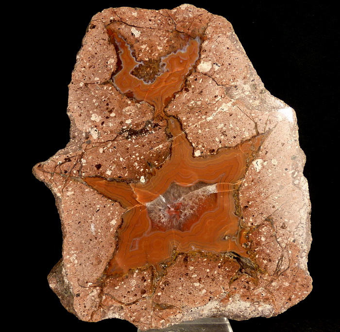 Przecięty i wypolerowany permski porfir z podwójnym agatem gwiaździstym o pięknym niepowtarzalnym rysunku.