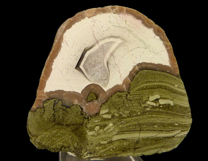 Przecięty i wypolerowany permski agat z fragmentem skały o niepowtarzalnym ciekawym rysunku.