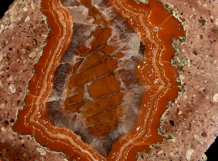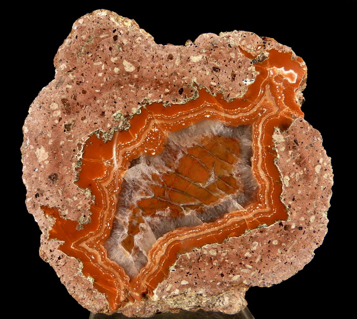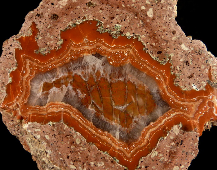 Przecięty i wypolerowany permski porfir z agatem i kwarcem o pięknym niepowtarzalnym rysunku.