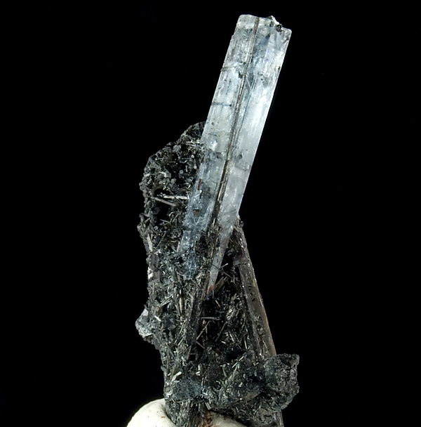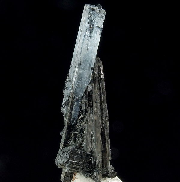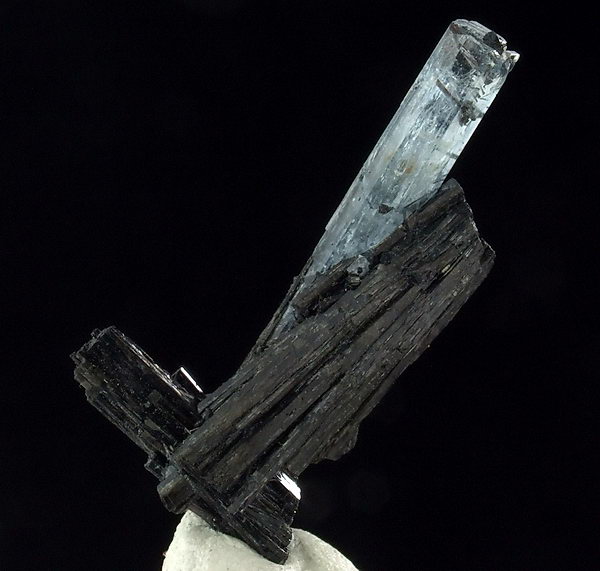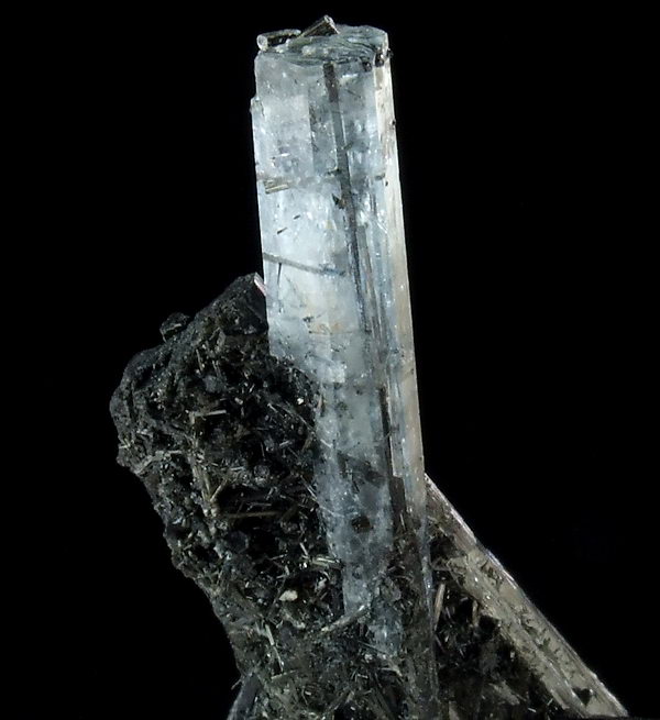 Błyszczący, dobrze wykształcony słupowy kryształ akwamarynu (beryl) osadzony na zrostach czarnego turmalinu.
