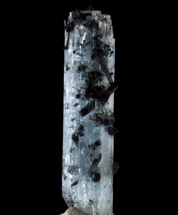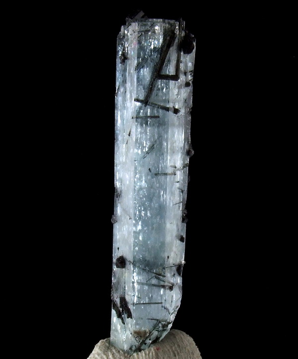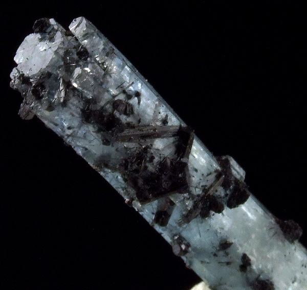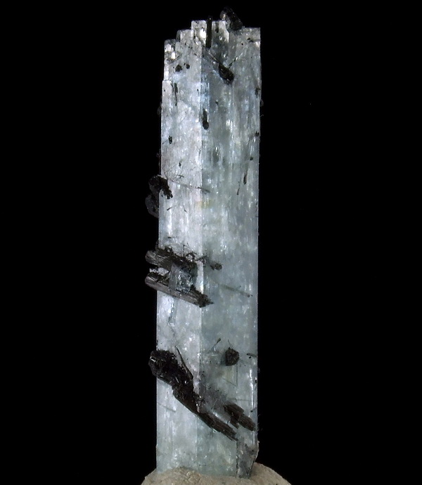 Błyszczący, dobrze wykształcony słupowy kryształ akwamarynu o pięknej barwie z czarnym turmalinem.