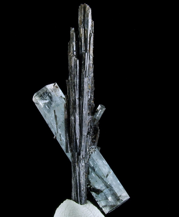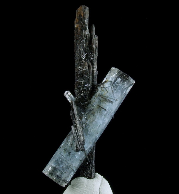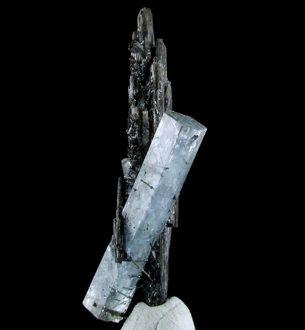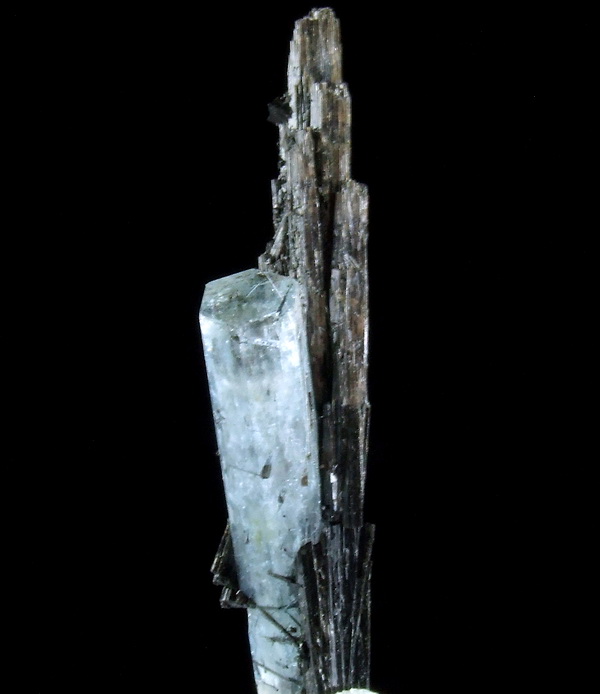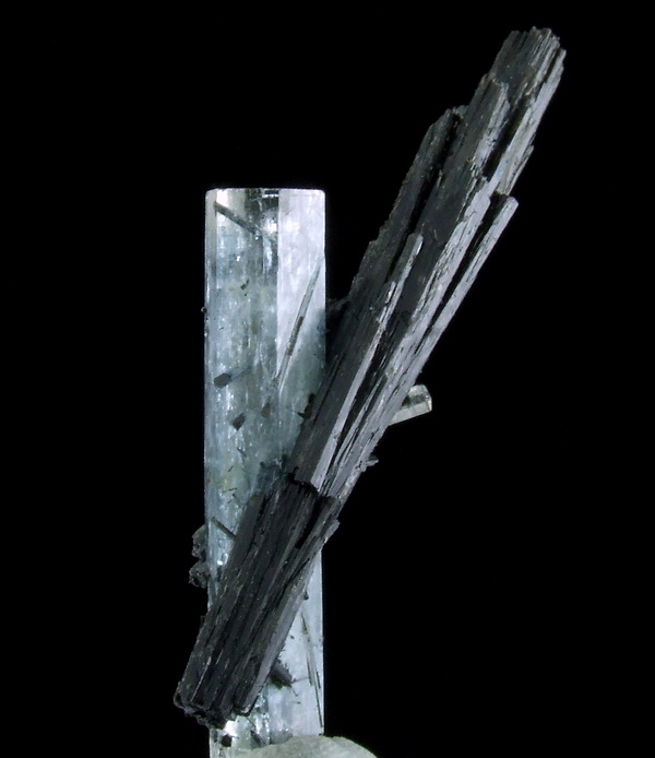 Błyszczący, dobrze wykształcone słupowy kryształ akwamarynu (beryl) z kryształami czarnego turmalinu.