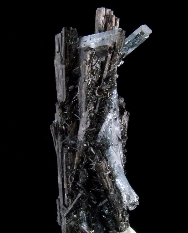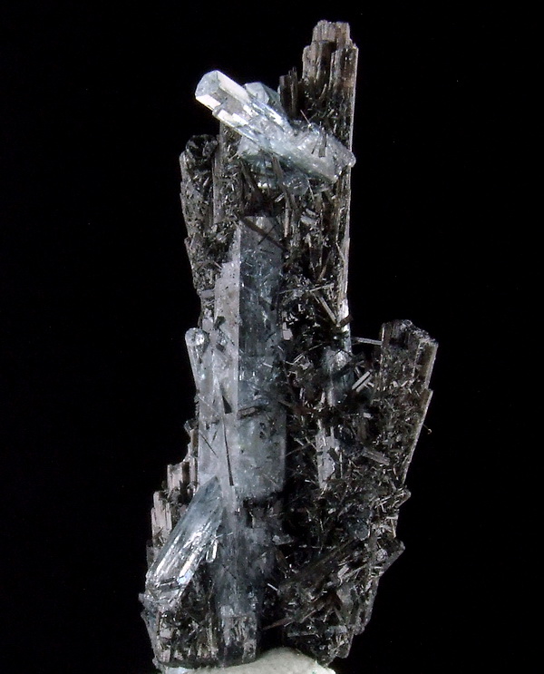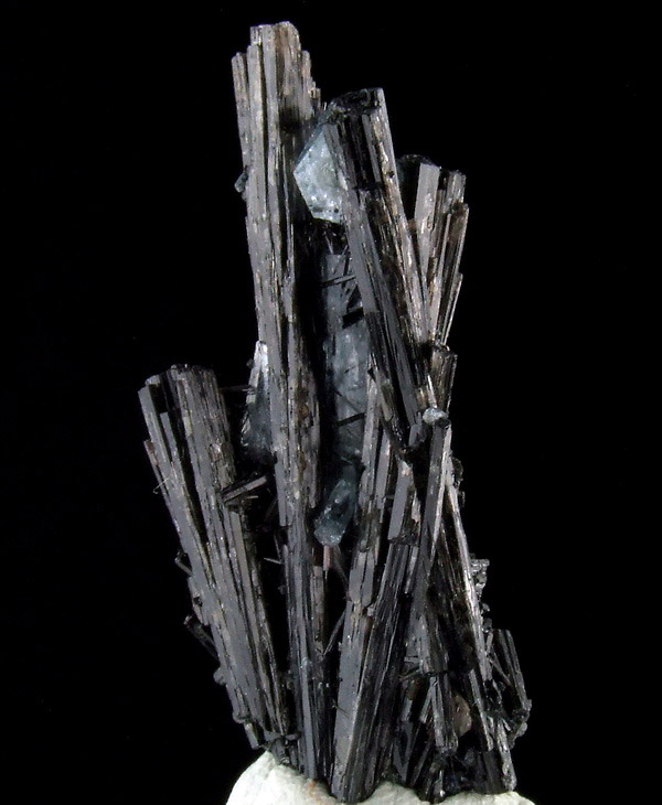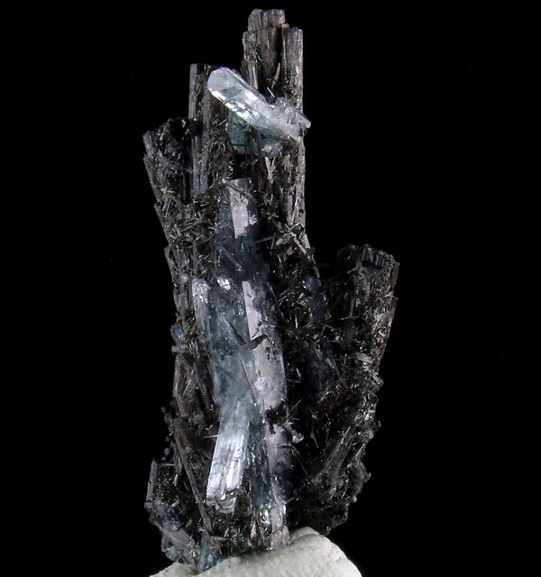 Błyszczące, dobrze wykształcone słupowe kryształy akwamarynu (beryl) osadzone na zrostach czarnego turmalinu.