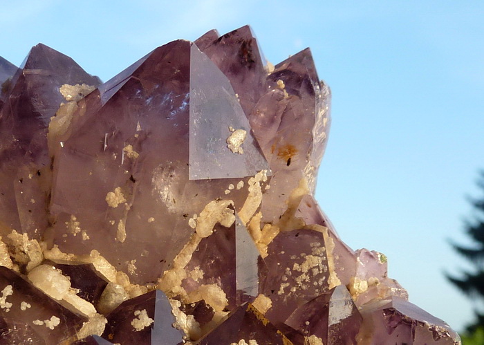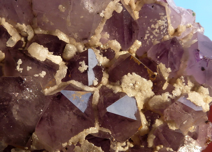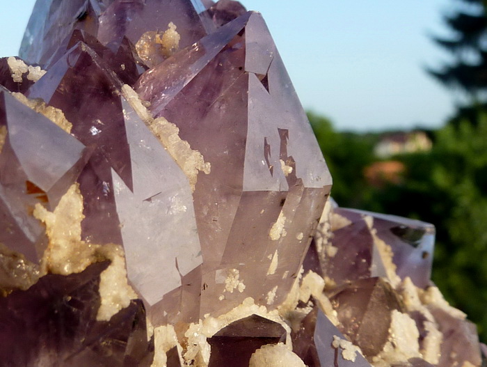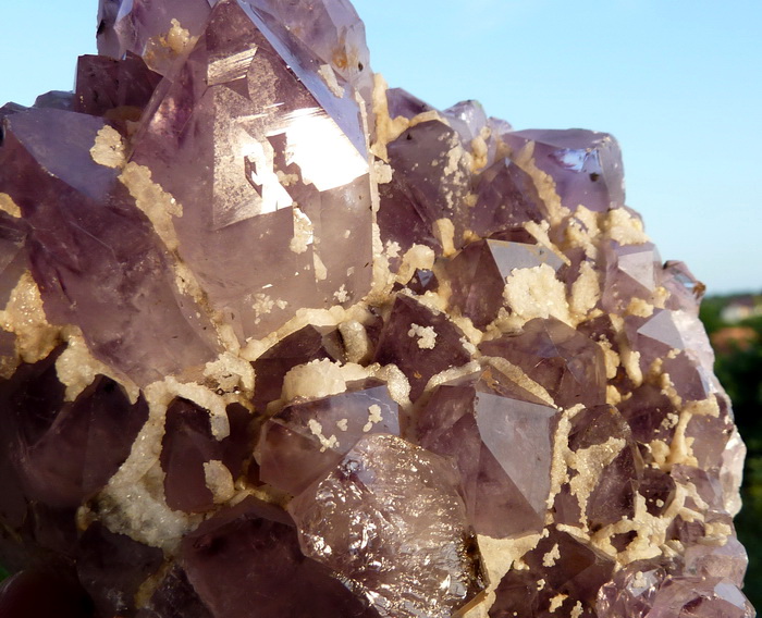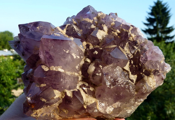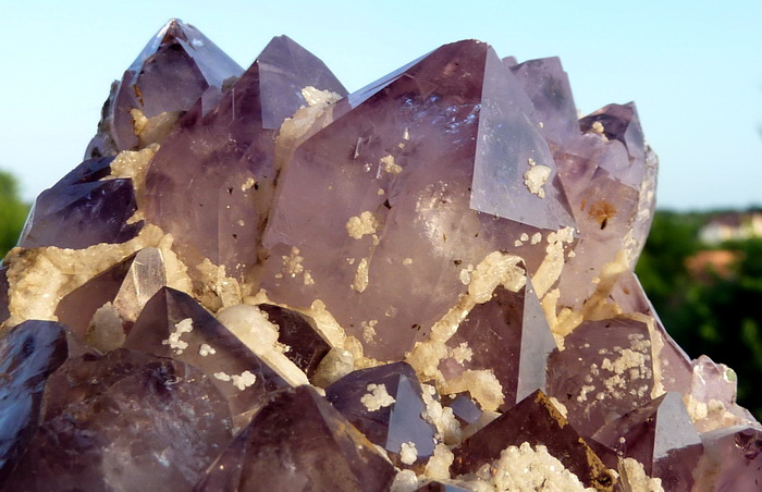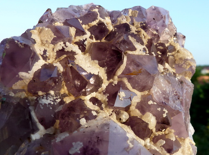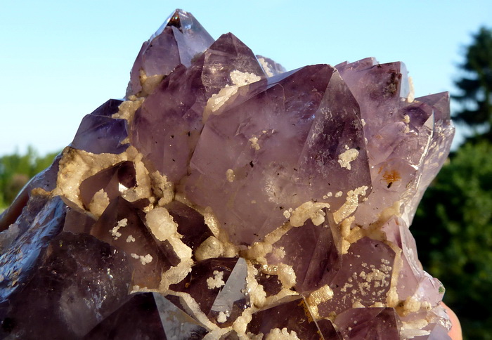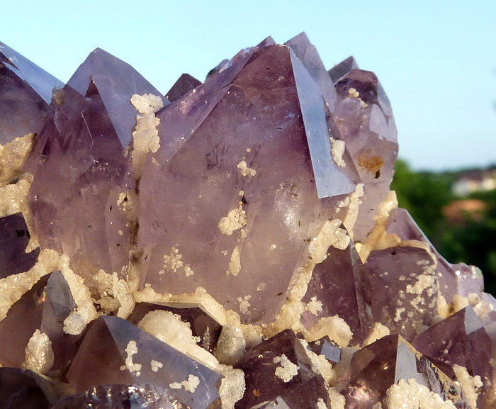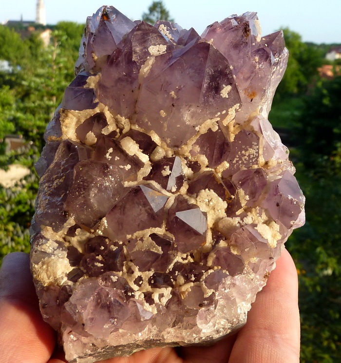 Szczotka z ładnie wykształconymi kryształami ametystu wraz z białym kalcytem.