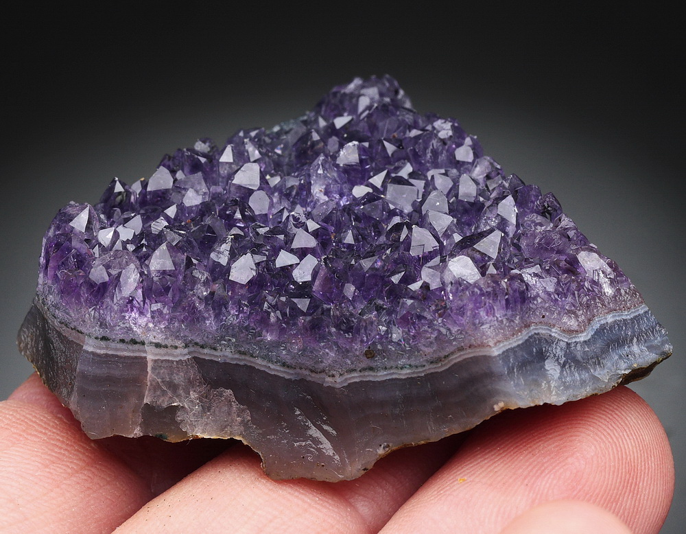 Błyszcząca szczotka dobrze wybarwionych kryształów ametystu.