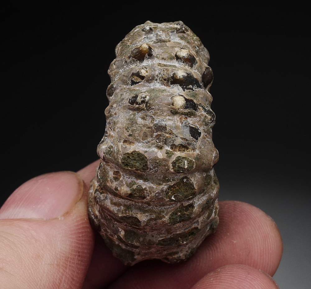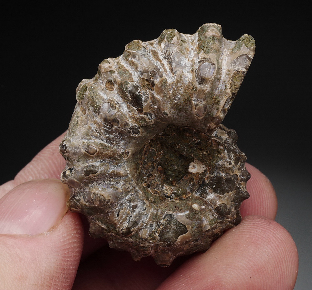 Dobrze zachowany okaz kredowego amonita Douvelliceras z zachowaną aragonitową muszla wykazującą wielobarwną opalescencję.