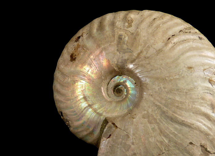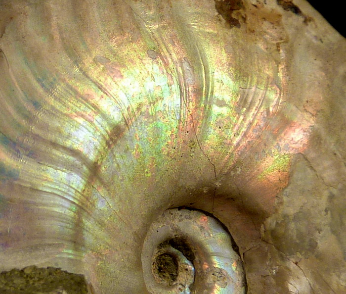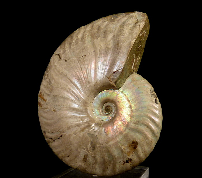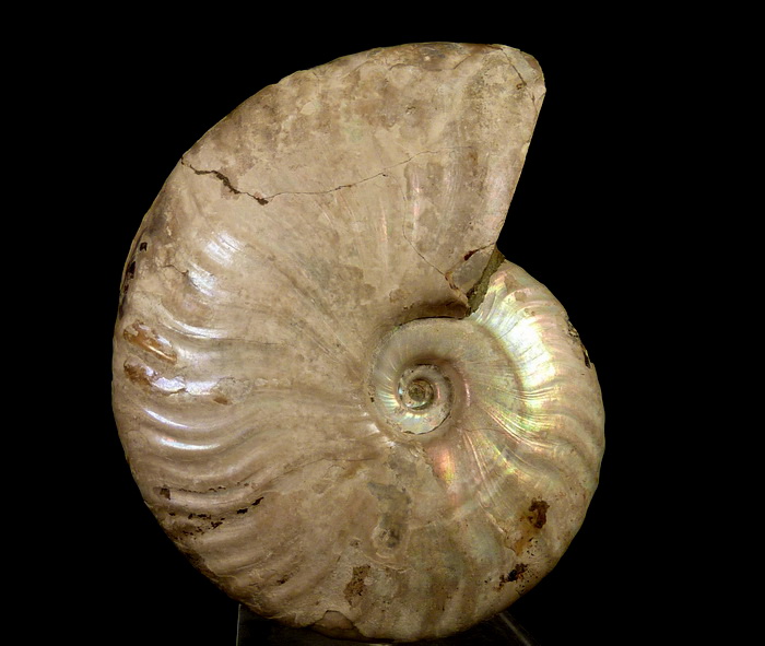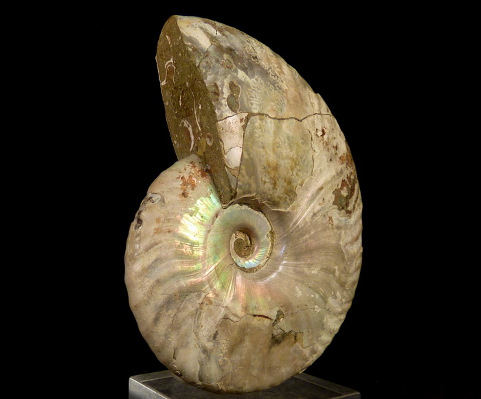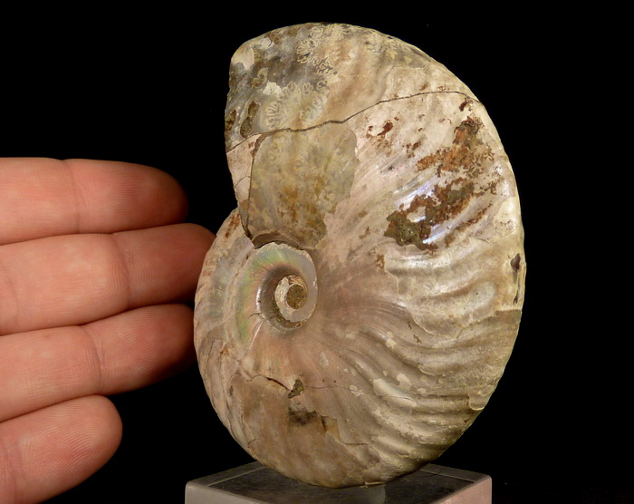 Rewelacyjnie zachowany kredowy amonit z piękną opalizującą aragonitową muszlą,