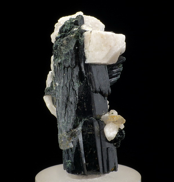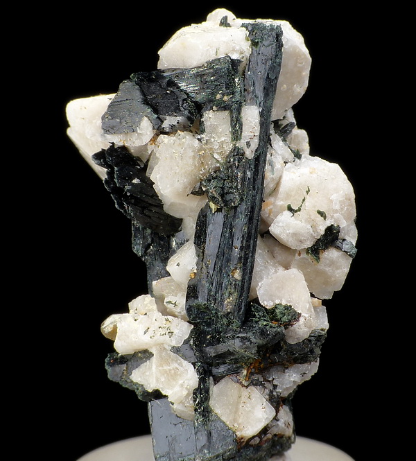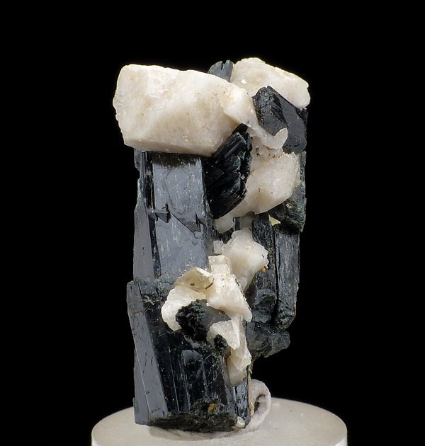 Błyszczące kryształy arfvedsonitu z kryształami ortoklazów.