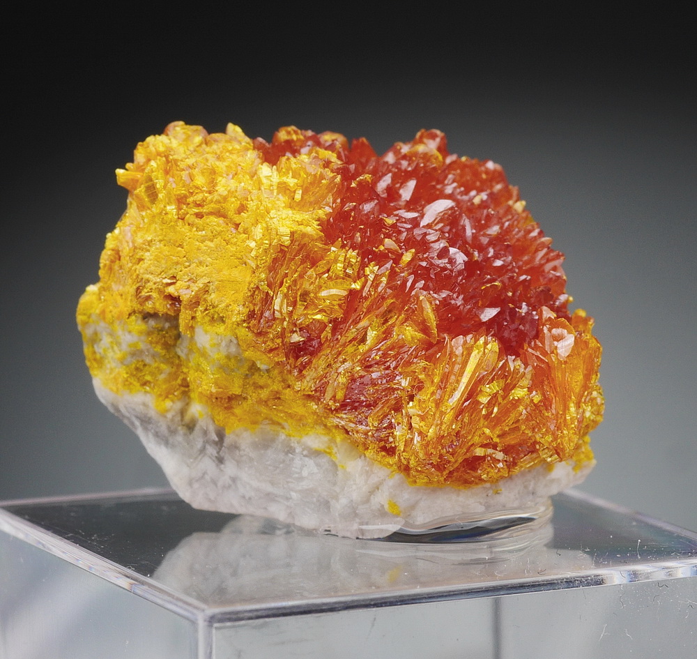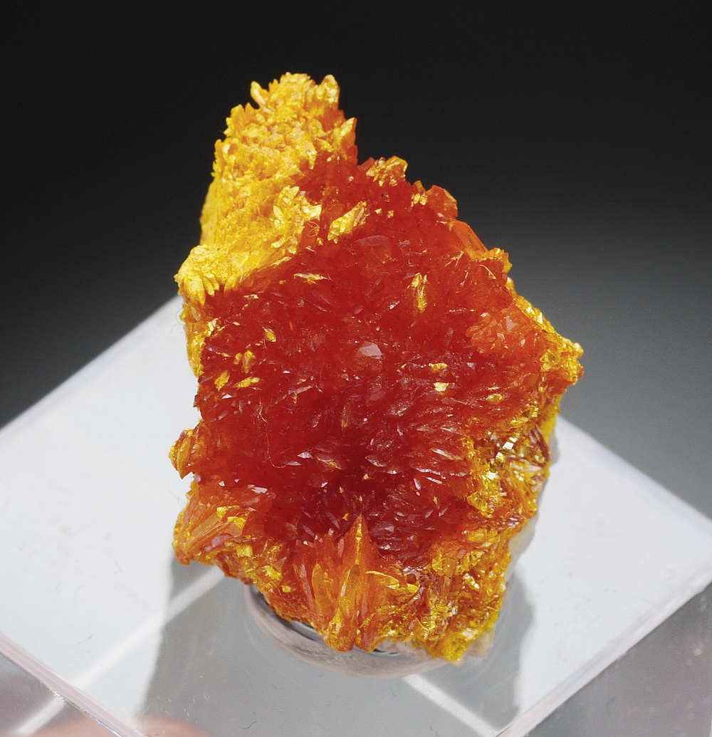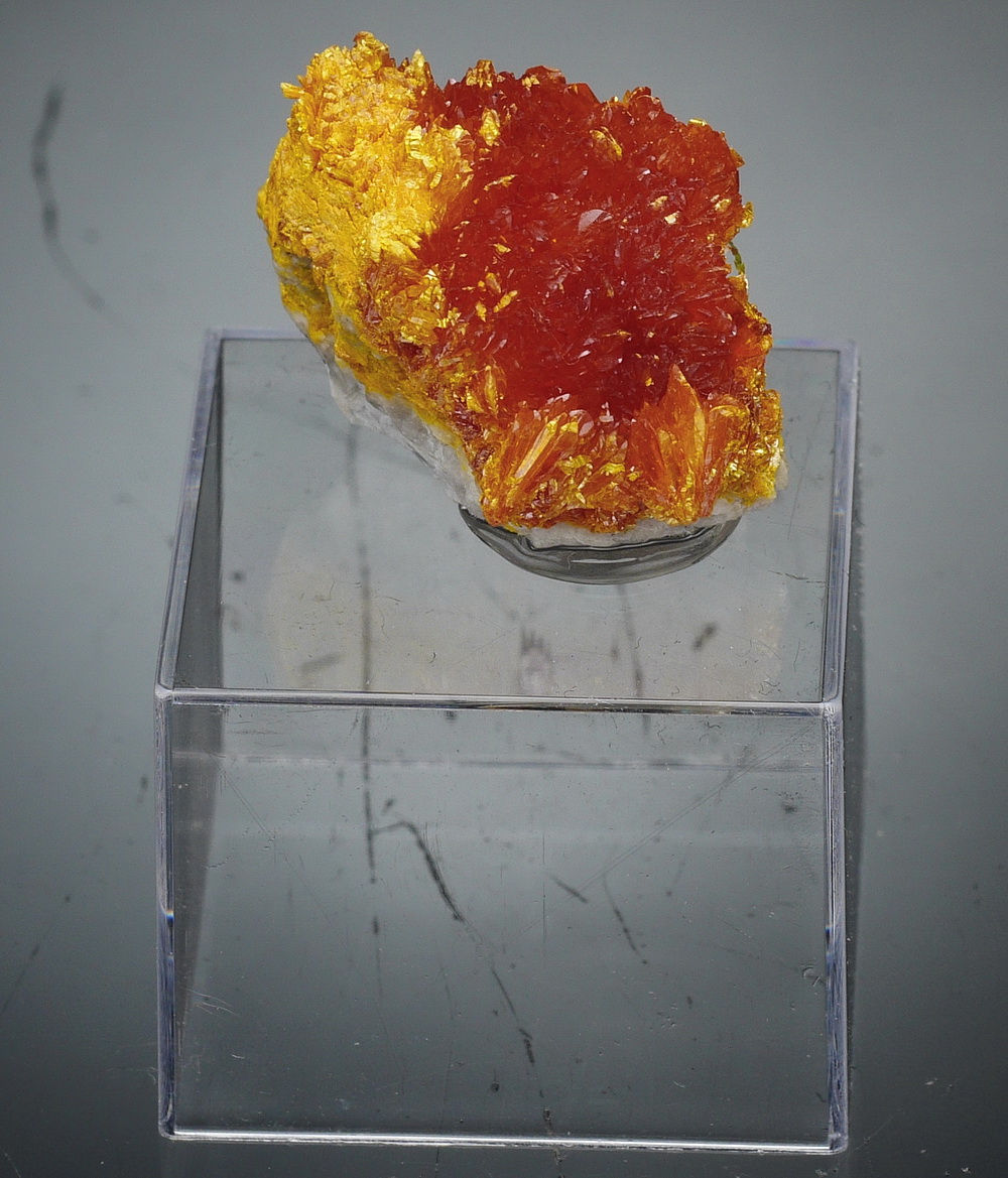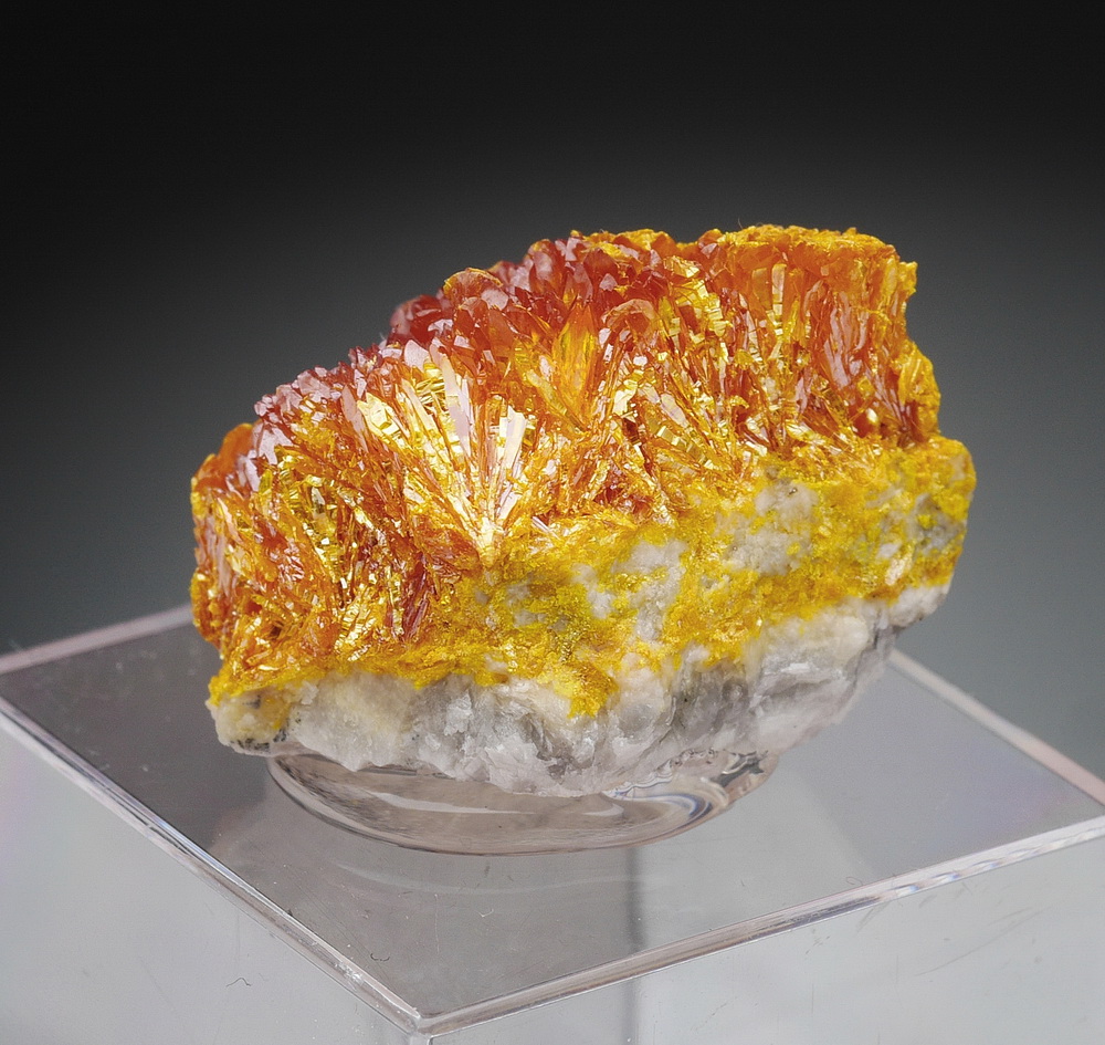 Skupienia kryształów aurypigmentu na matrixie. Okaz przyklejony na podstawce.