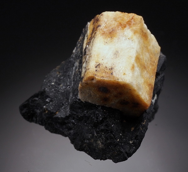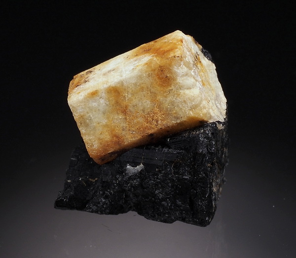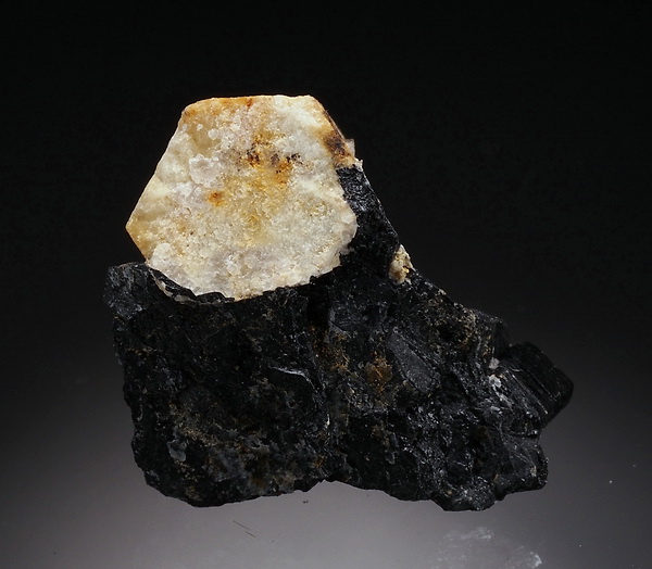 Kryształ berylu o dobrze wykształconych ścianach bocznych, na czarnym turmalinie
