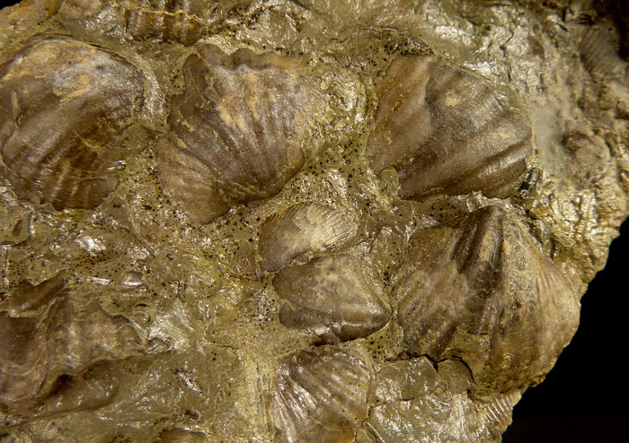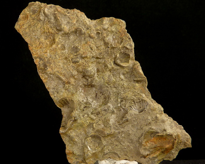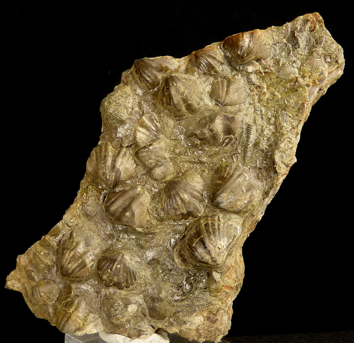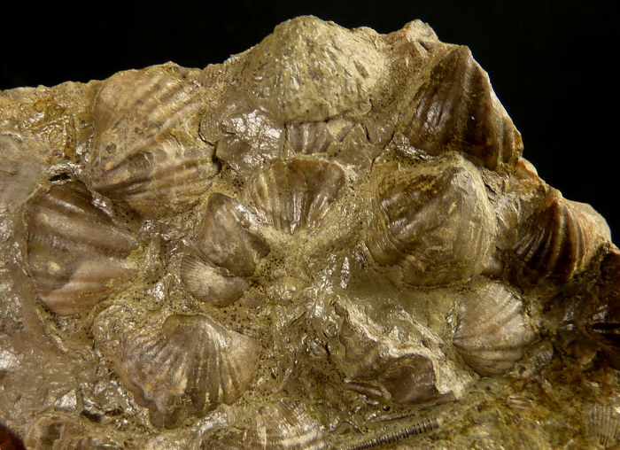 Liczne, bardzo dobrze zachowane dewońskie brachiopody wraz z tentakulitami na wapiennej płycie.