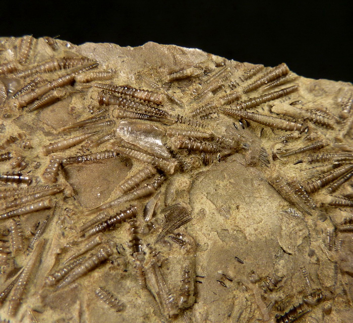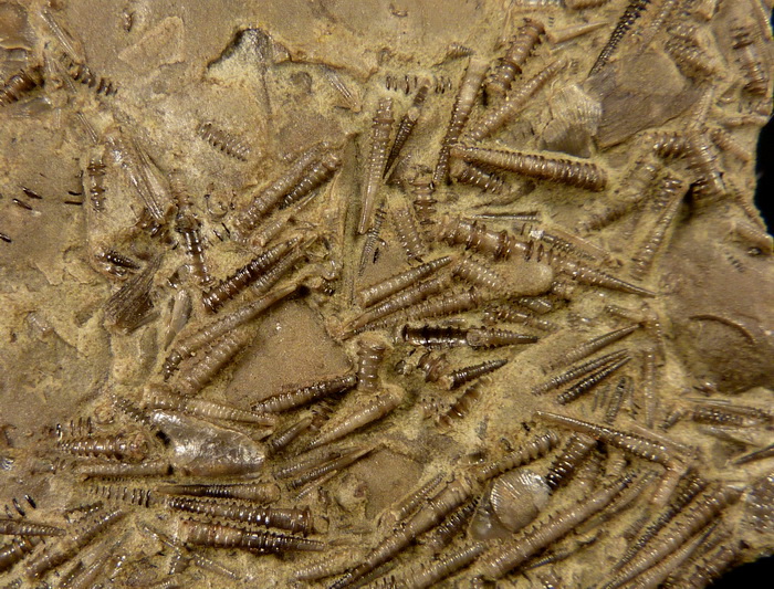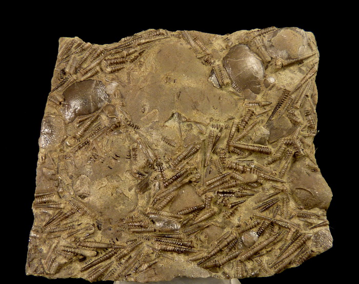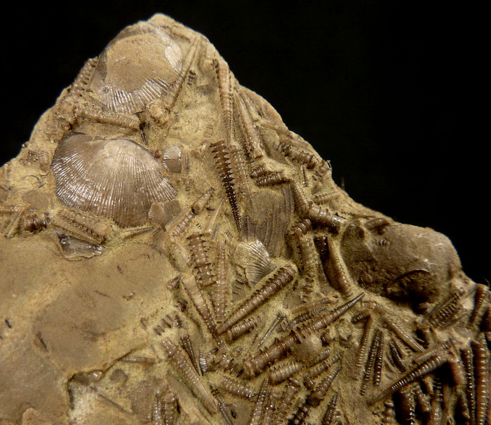 Liczne, bardzo dobrze zachowane dewońskie brachiopody wraz z tentakulitami na wapiennej płycie.