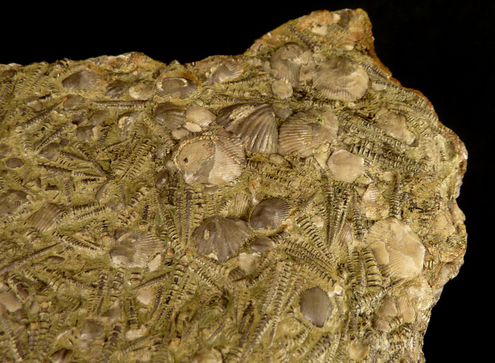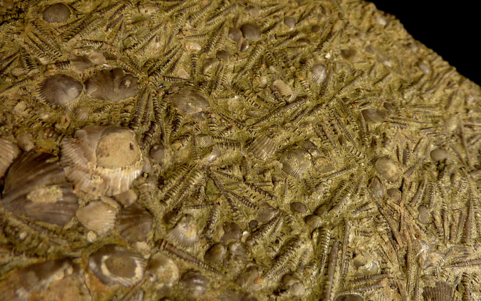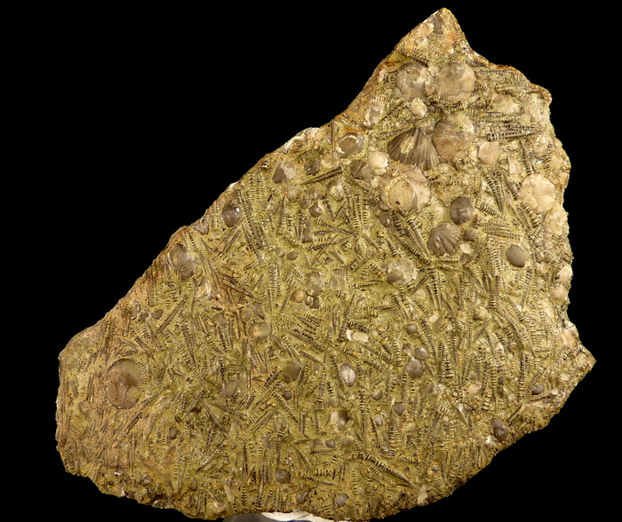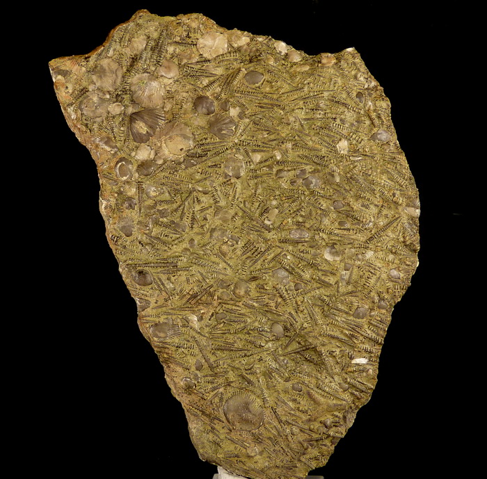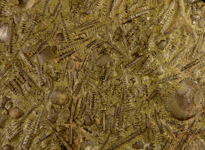 Liczne, bardzo dobrze zachowane dewońskie brachiopody wraz z tentakulitami na wapiennej płycie.