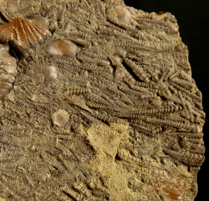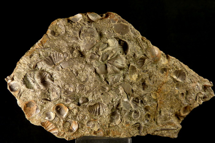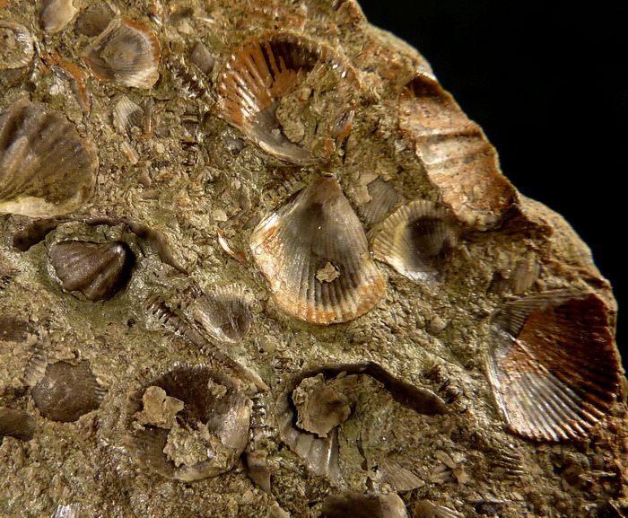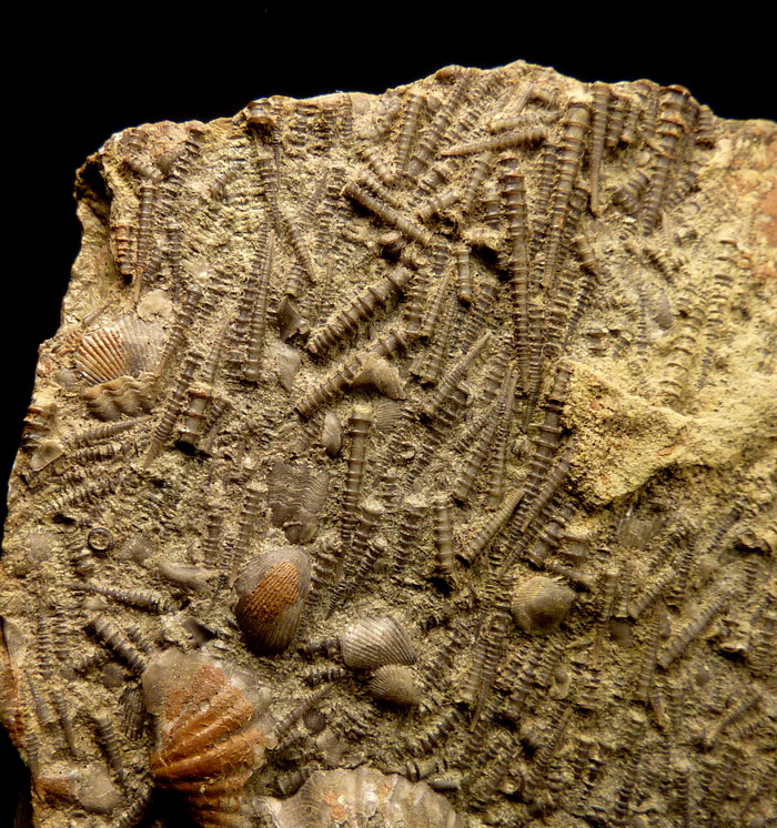 Liczne, bardzo dobrze zachowane dewońskie brachiopody wraz z tentakulitami na wapiennej płycie.