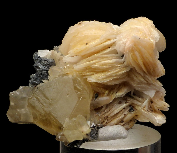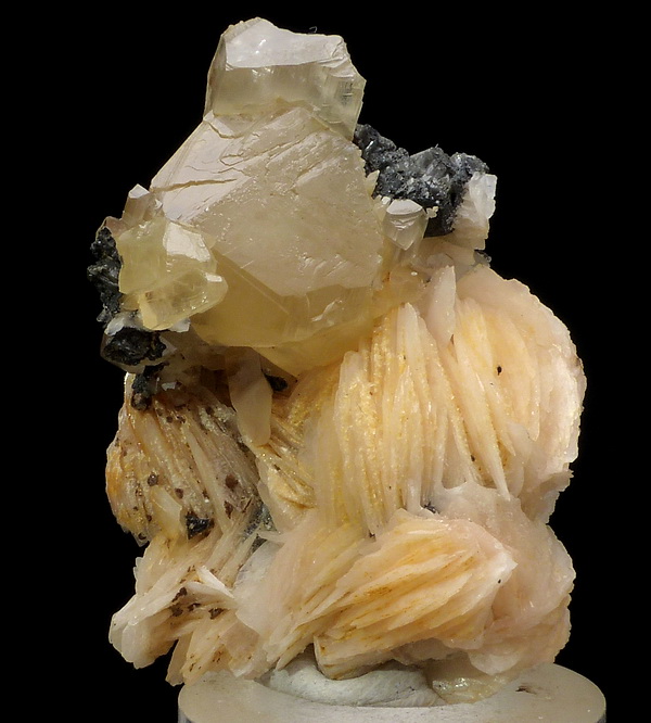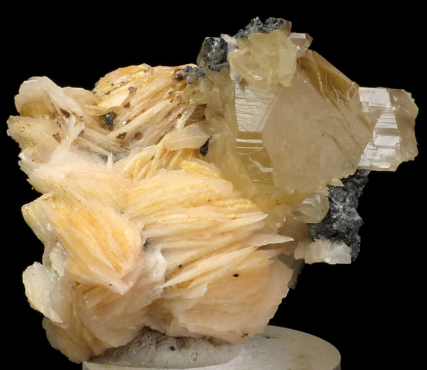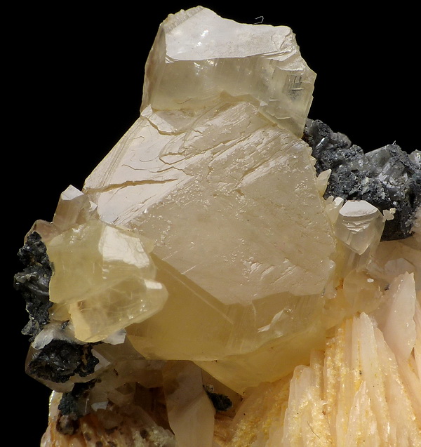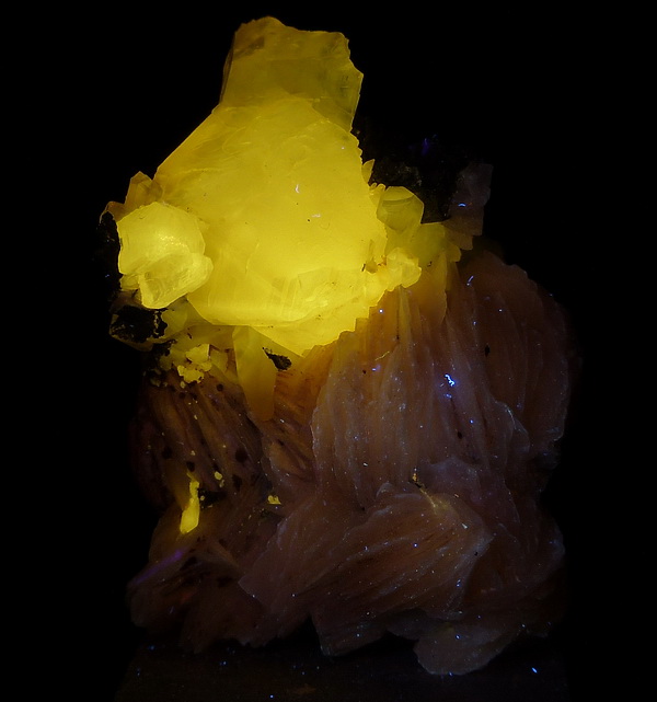 Duży kryształ cerusytu osadzony na blaszkowych skupieniach barytu - okaz świeci w świetle UV !