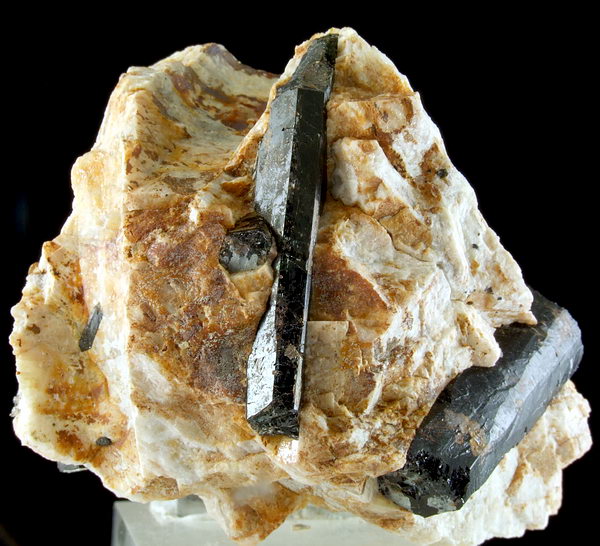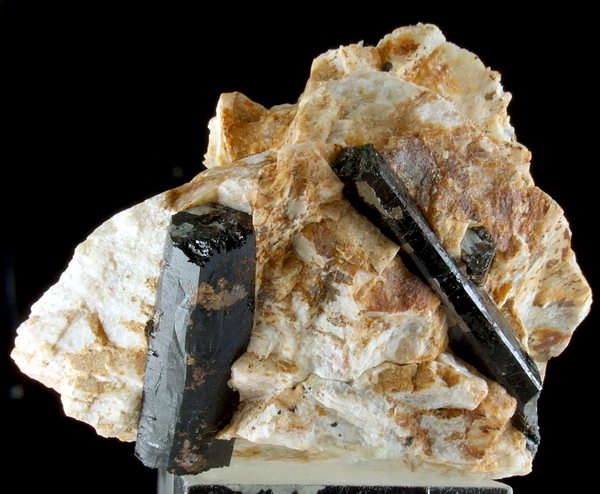 Ładnie wykształcone i silnie błyszczace kryształy turmalinów na pegmatycie.