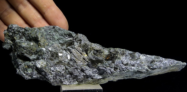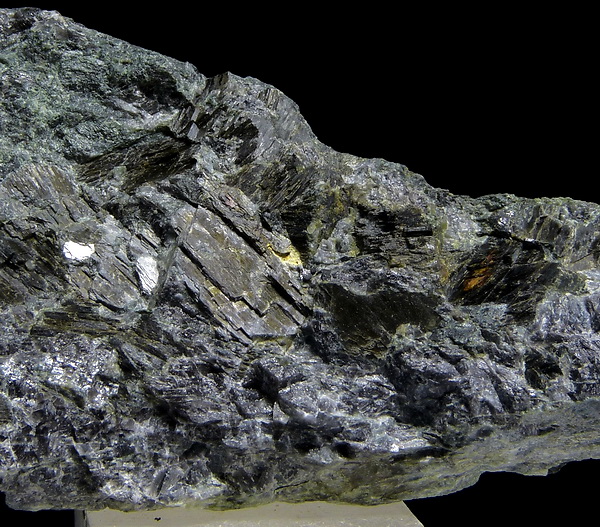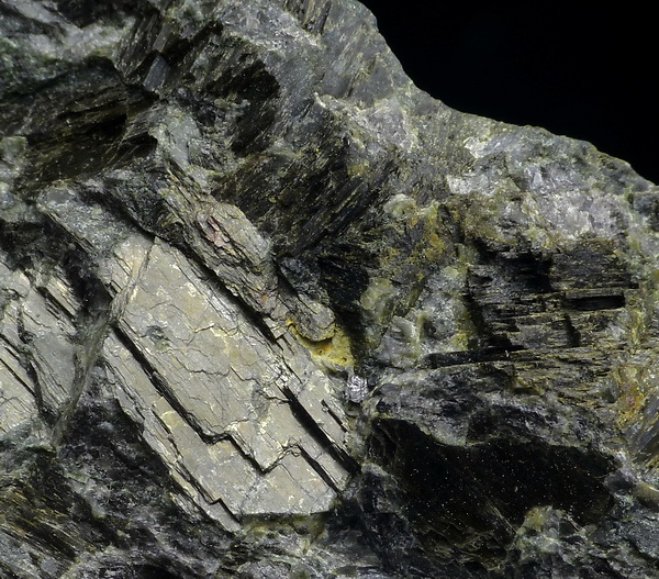 Liczne, duże kryształy diallagu w gabrze o wyraźnej łupliwości i połysku.