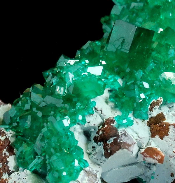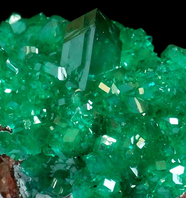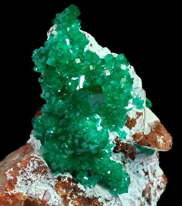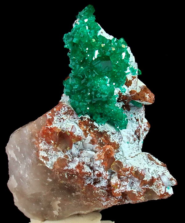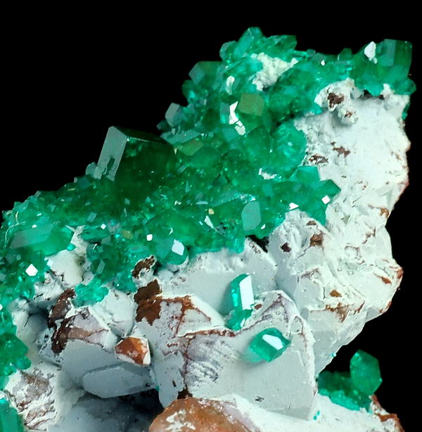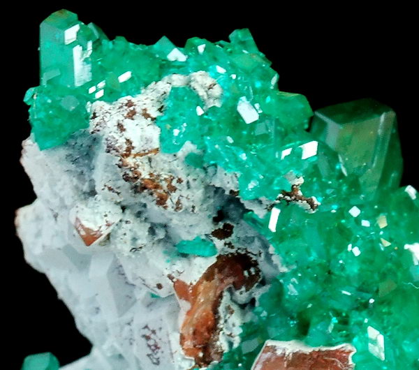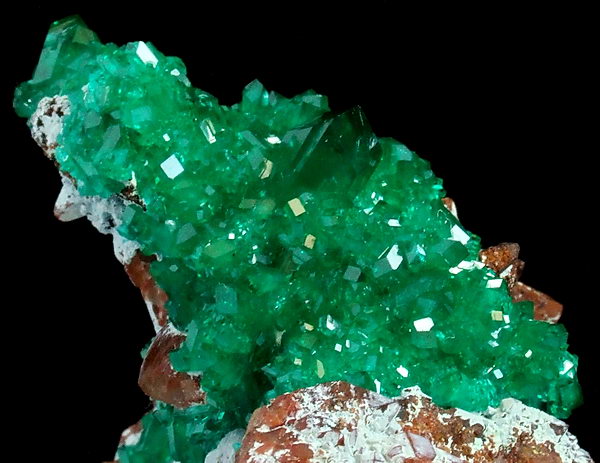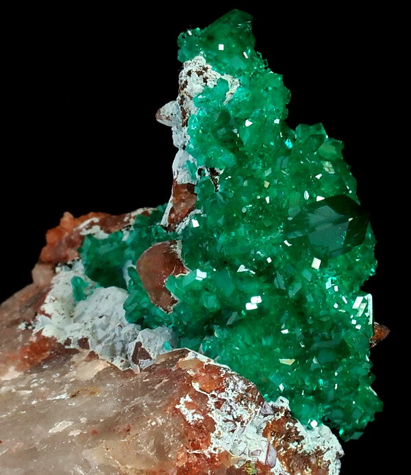 Szczotka bardzo błyszczących, przezroczystych kryształów rzadkiego dioptazu o niesamowitej szmaragdowozielonej barwie, osadzone na shattuckicie i kwarcu !!