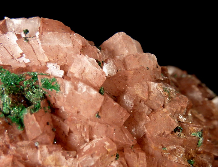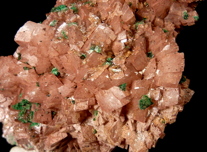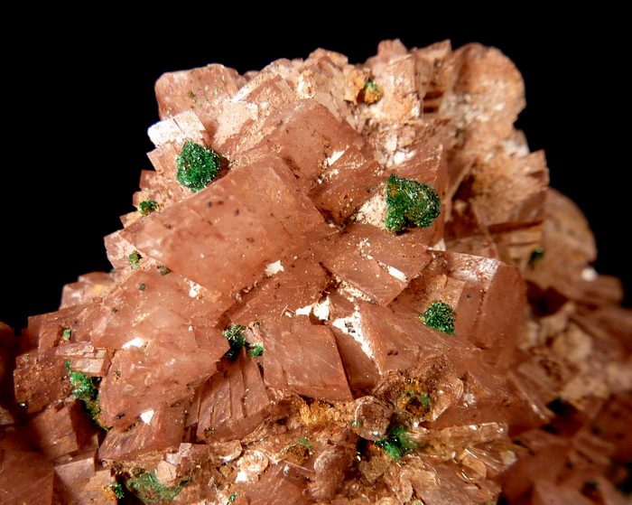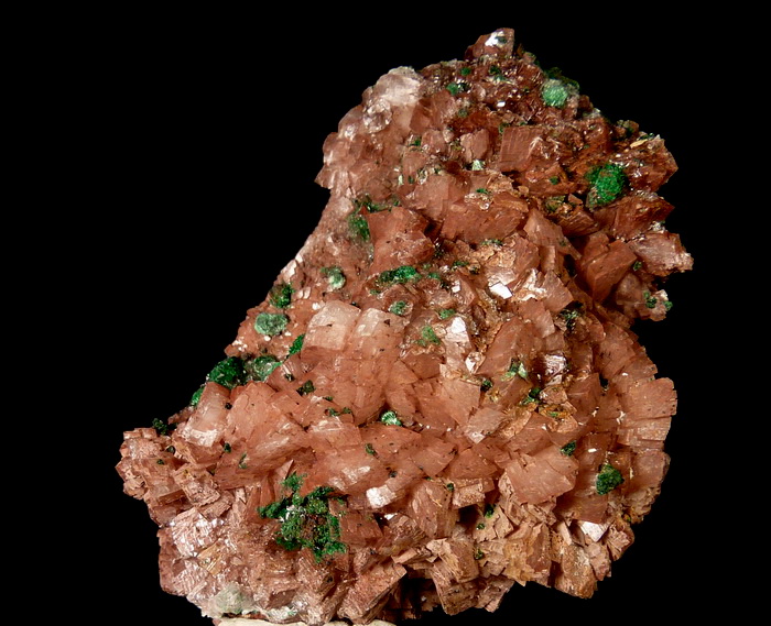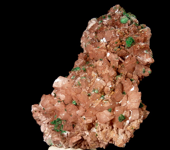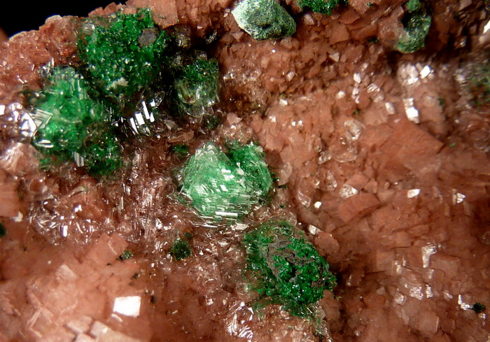 Ciekawy okaz rzadkiego zielonego brochantytu wraz z przezroczystym gipsem na dobrze wykształconych kryształach dolomitu.