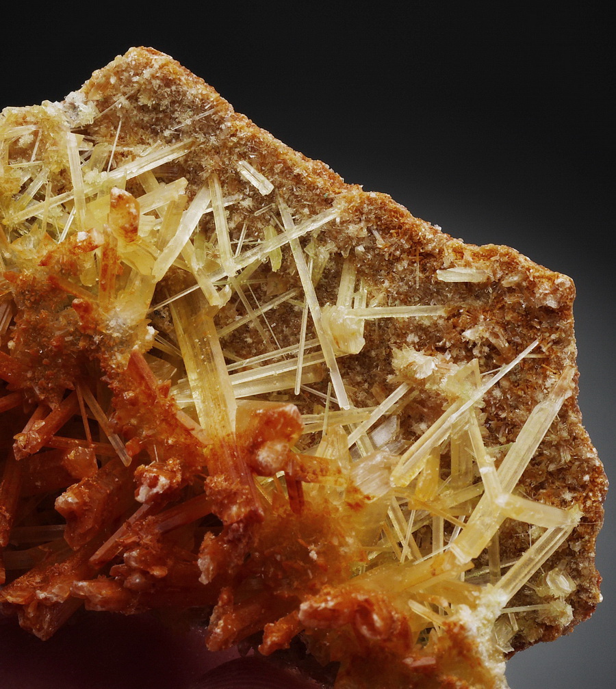 Zrost ładnie wykształconych i błyszczących kryształów gipsu z inkluzjami żelazistymi. Kryształy częsciowo przezroczyste.