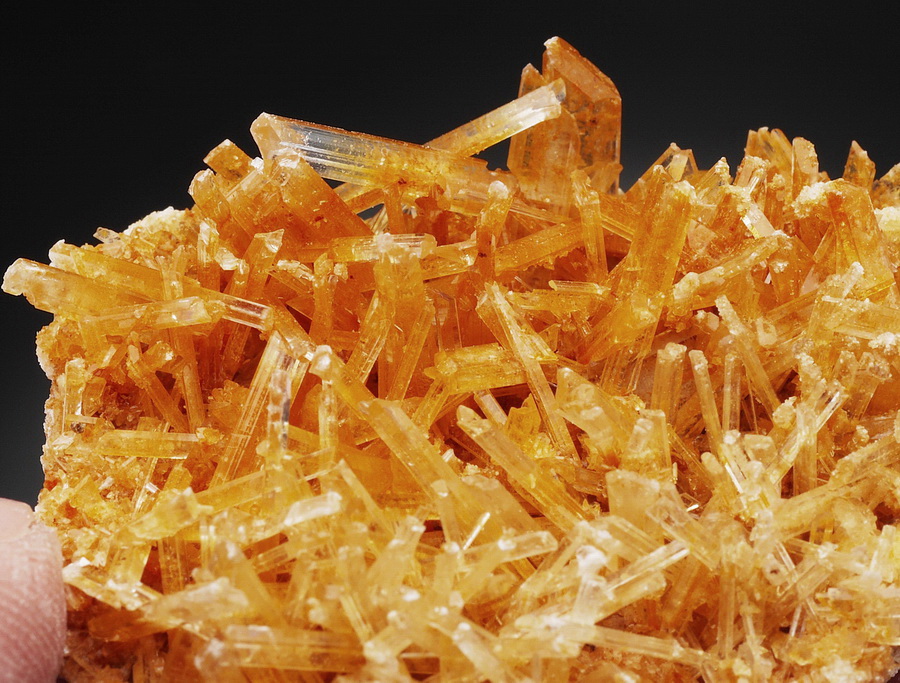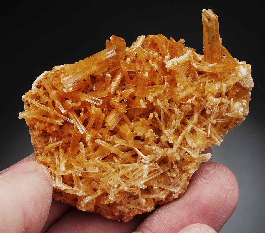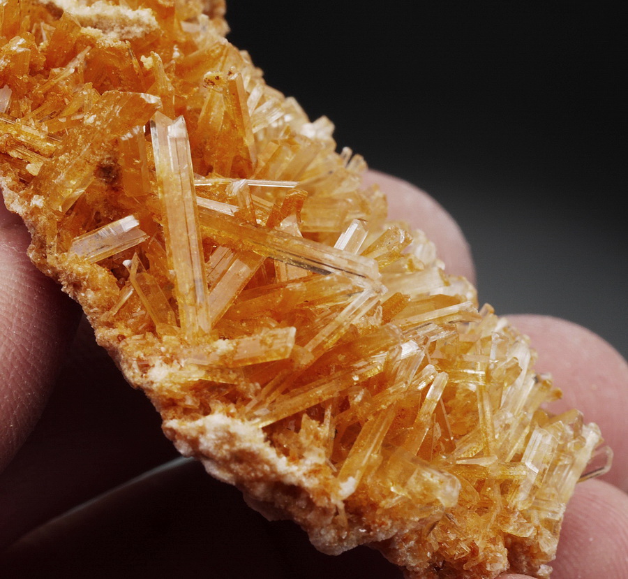 Zrost ładnie wykształconych i błyszczących kryształów gipsu z inkluzjami żelazistymi. Kryształy częsciowo przezroczyste.