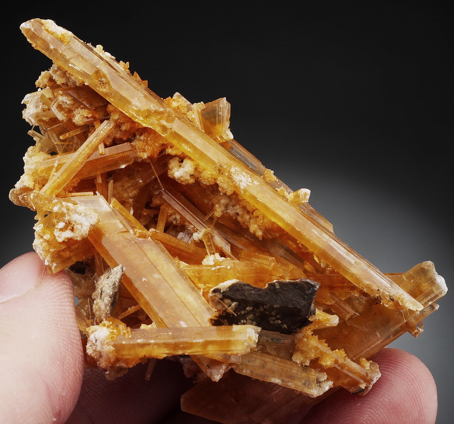 Zrost ładnie wykształconych i błyszczących kryształów gipsu z inkluzjami żelazistymi. Kryształy częsciowo przezroczyste.