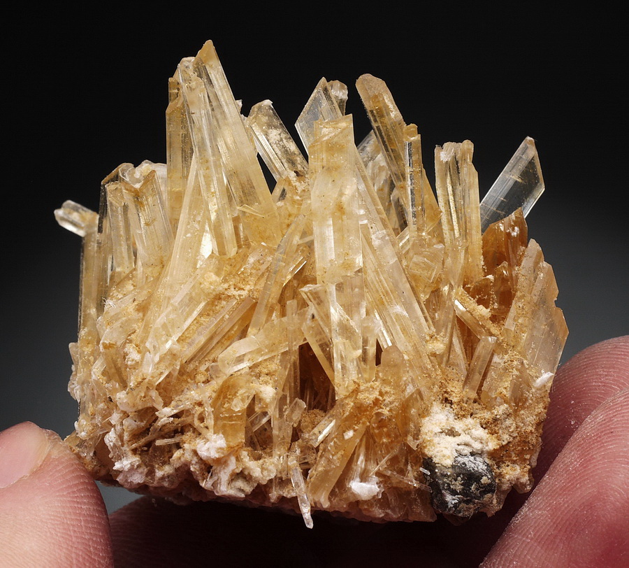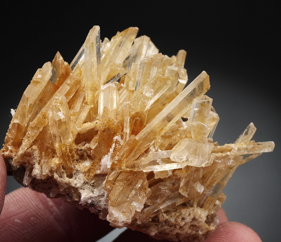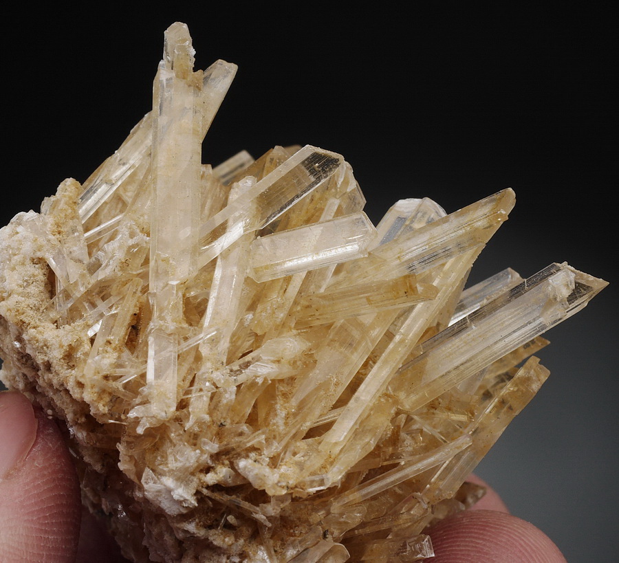 Zrost ładnie wykształconych i błyszczących kryształów gipsu z inkluzjami żelazistymi. Kryształy częsciowo przezroczyste.
