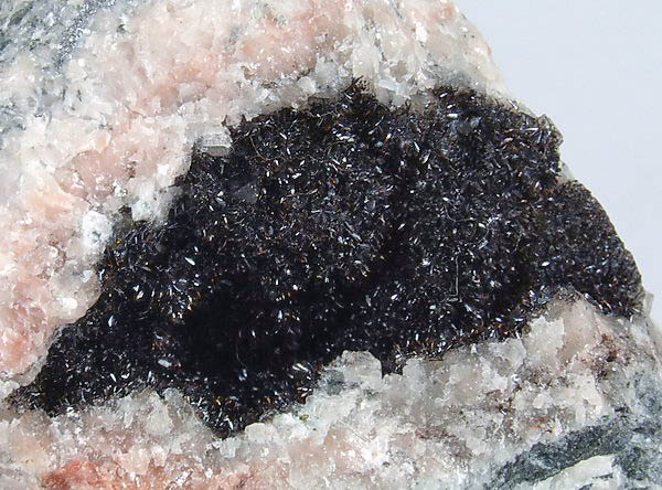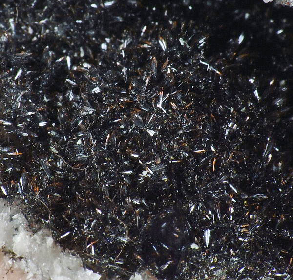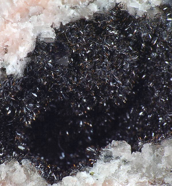 Błyszczące igiełkowe kryształty goethytu na kalcytowym matrixie w geodzie.