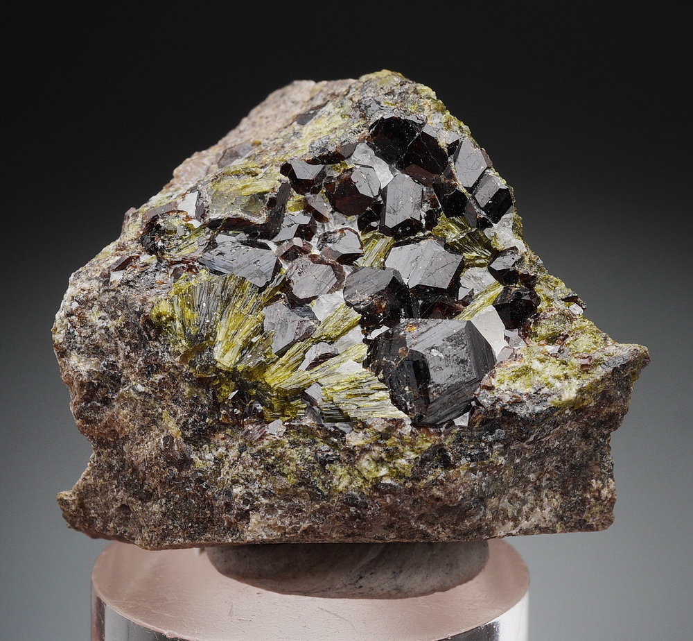 Estetyczny okaz dobrze wykształconych, bardzo błyszczących kryształów granatu z epidotem na matrixie.