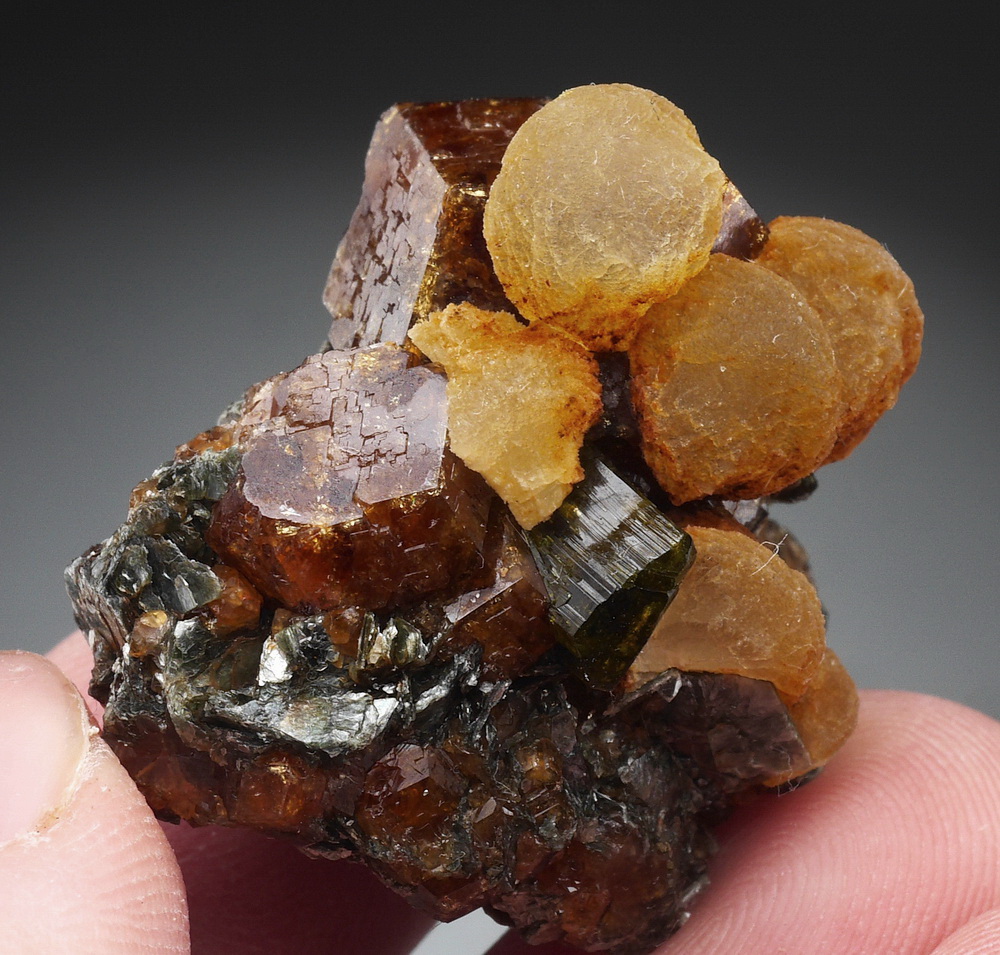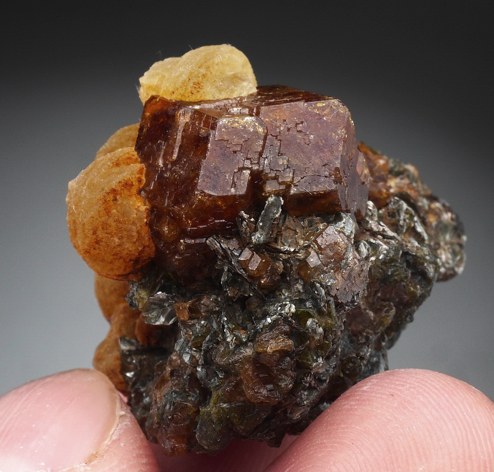 Dobrze wykształcone kryształy granatu - grossularu z muskowitem i prehnitem i epidotem.