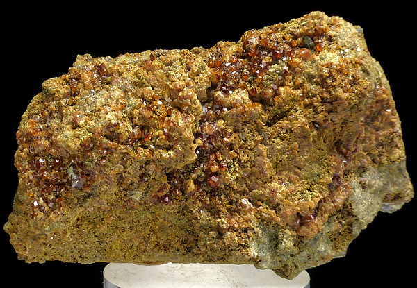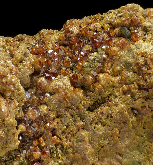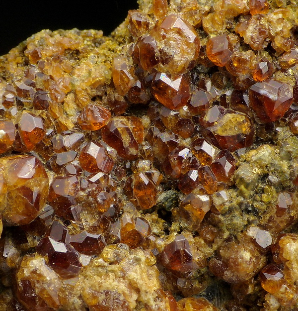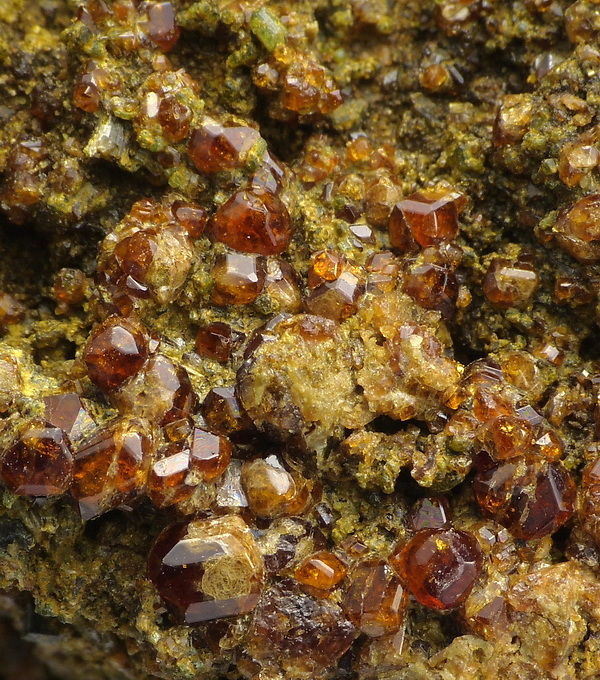 Błyszczące kryształy hessonitu (granat) na matrixie.